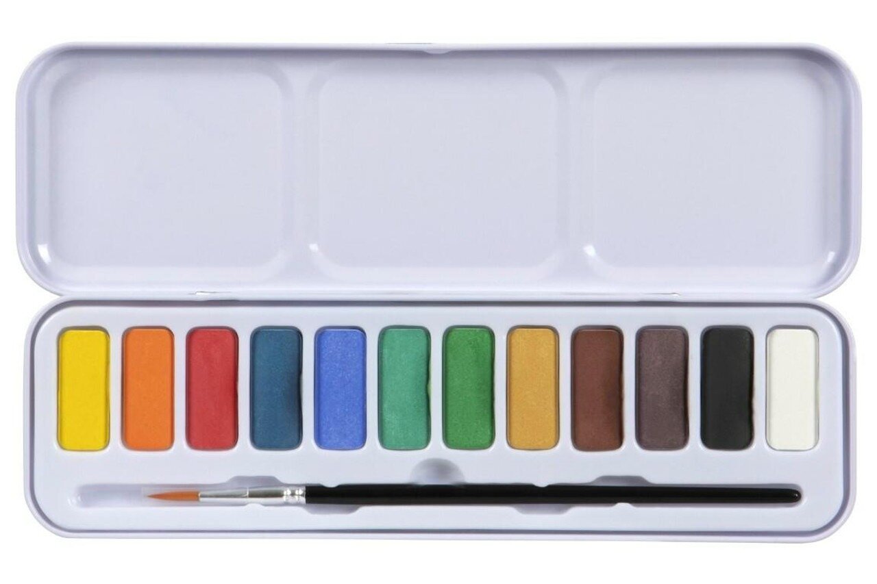 Дополнительные характеристики: краски упакованы в металлический пенал, крышку которого можно использовать как палитру. В комплектацию входит синтетическая кисть