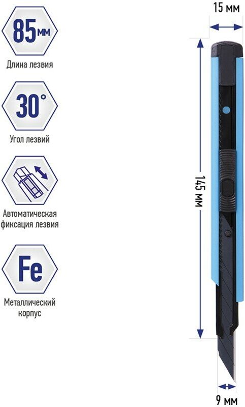 Серия ColorZone . Нож канцелярский с автоматической системой фиксации лезвия auto-lock. Корпус ножа металлический. Комплектуется износостойким стальным лезвием с углом 30 градусов черного цвета, для более легкого скольжения. Ширина лезвия - 9 мм.