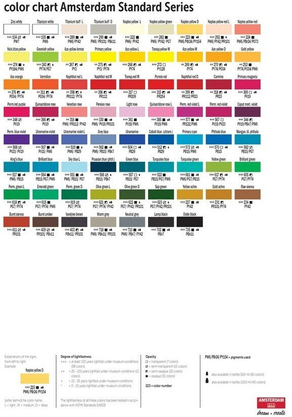 Акрил AMSTERDAM изготавливается из тщательно отобранных пигментов и акриловых смол. Краска универсальна в своем использовании, ложится на любую предварительно обезжиренную поверхность. Не имеет резкого запаха, что позволяет работать в помещении. Художественная акриловая краска AMSTERDAM проста в использовании. Все цвета смешиваются между собой и при необходимости разбавляются водой. После высыхания образуют прочную водонепроницаемую пленку. Цвета устойчивы к воздействию света. Для придания специальных эффектов, краску можно использовать с медиумами для акриловой живописи.