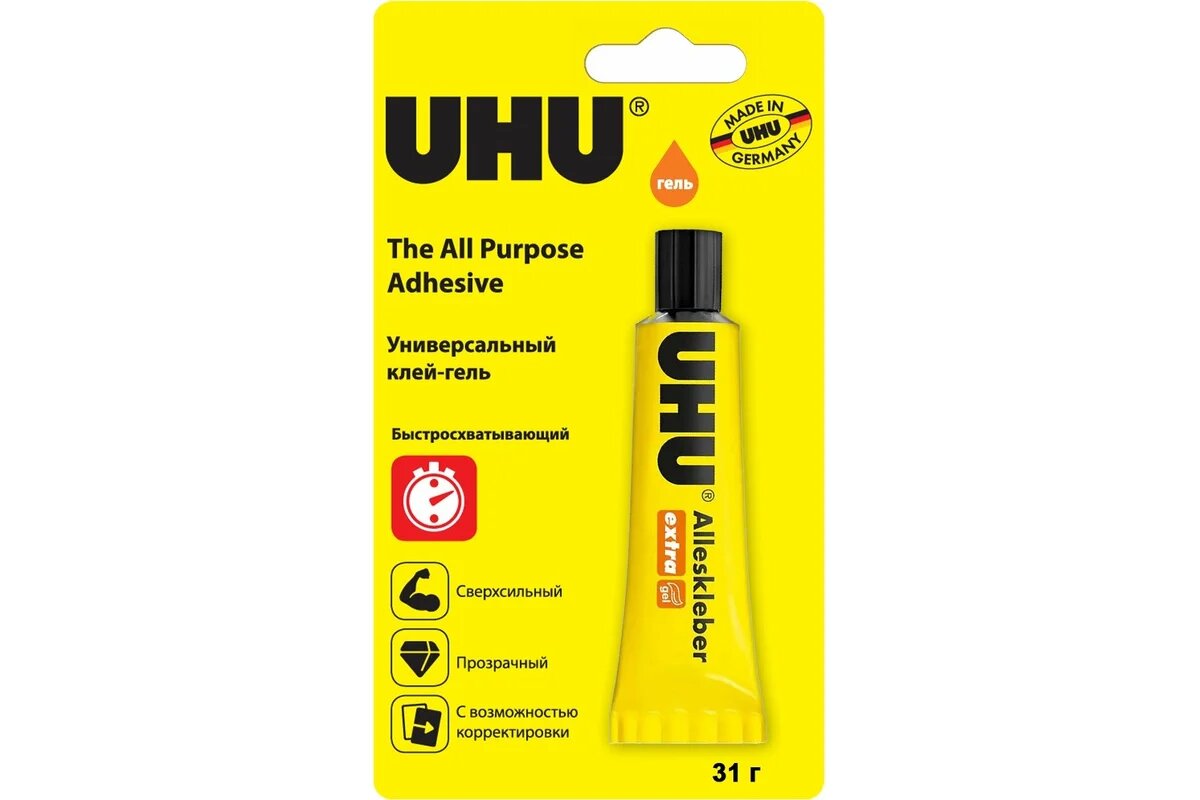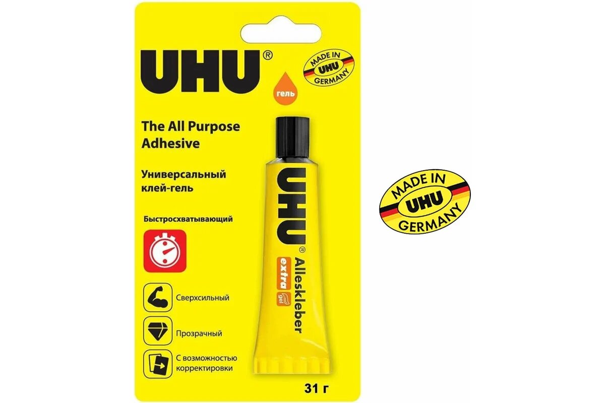 Клей универсальный UHU Alleskleber Gel. Универсальный прозрачный клей на основе синтетической смолы. Склеивает фарфор, дерево, металл, стекло, керамику, плексиглас, войлок, кору, пробку, картон, бумагу. Идеальный клей для хозяйственных и ремонтный работ, хобби, моделирования.