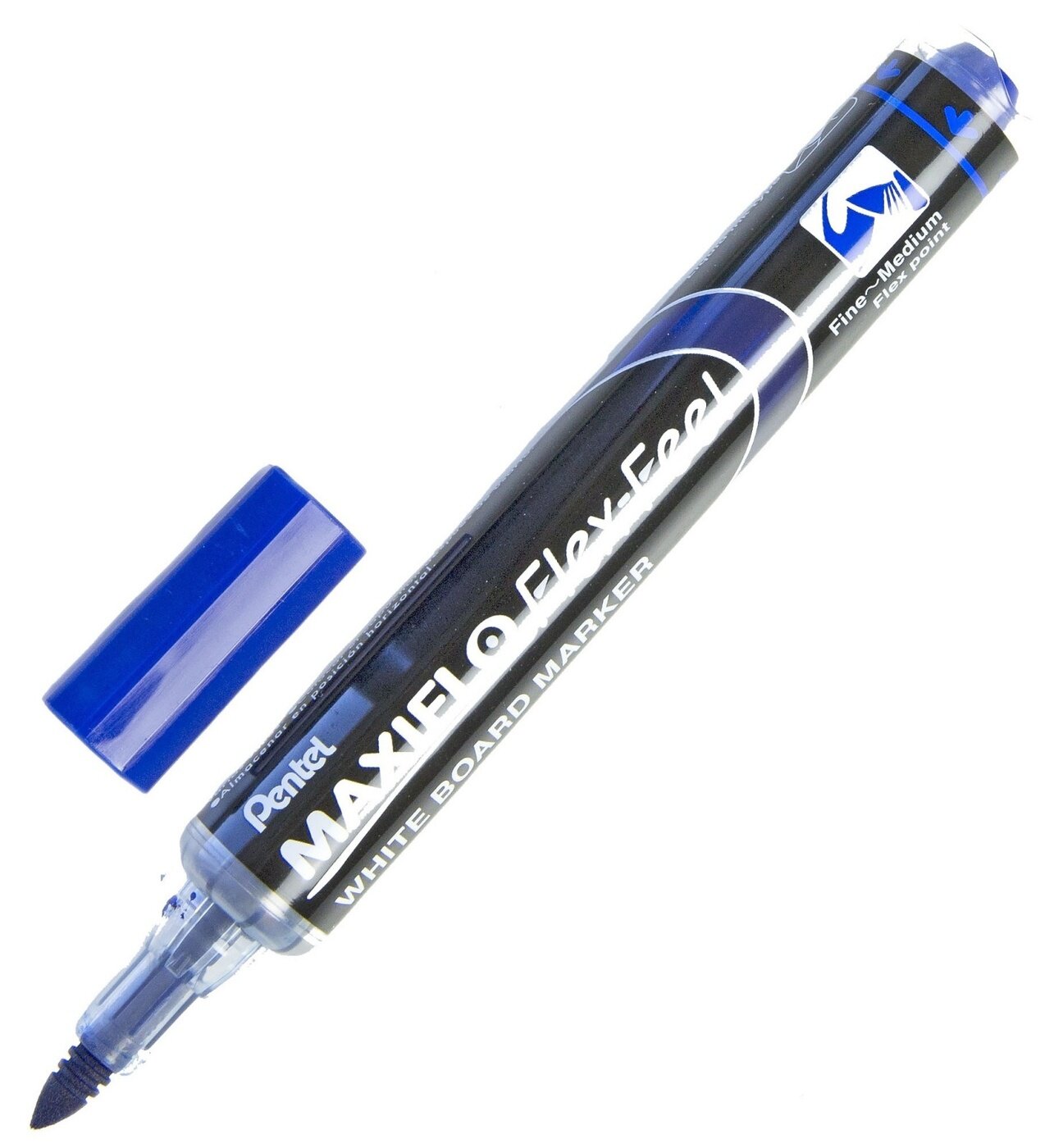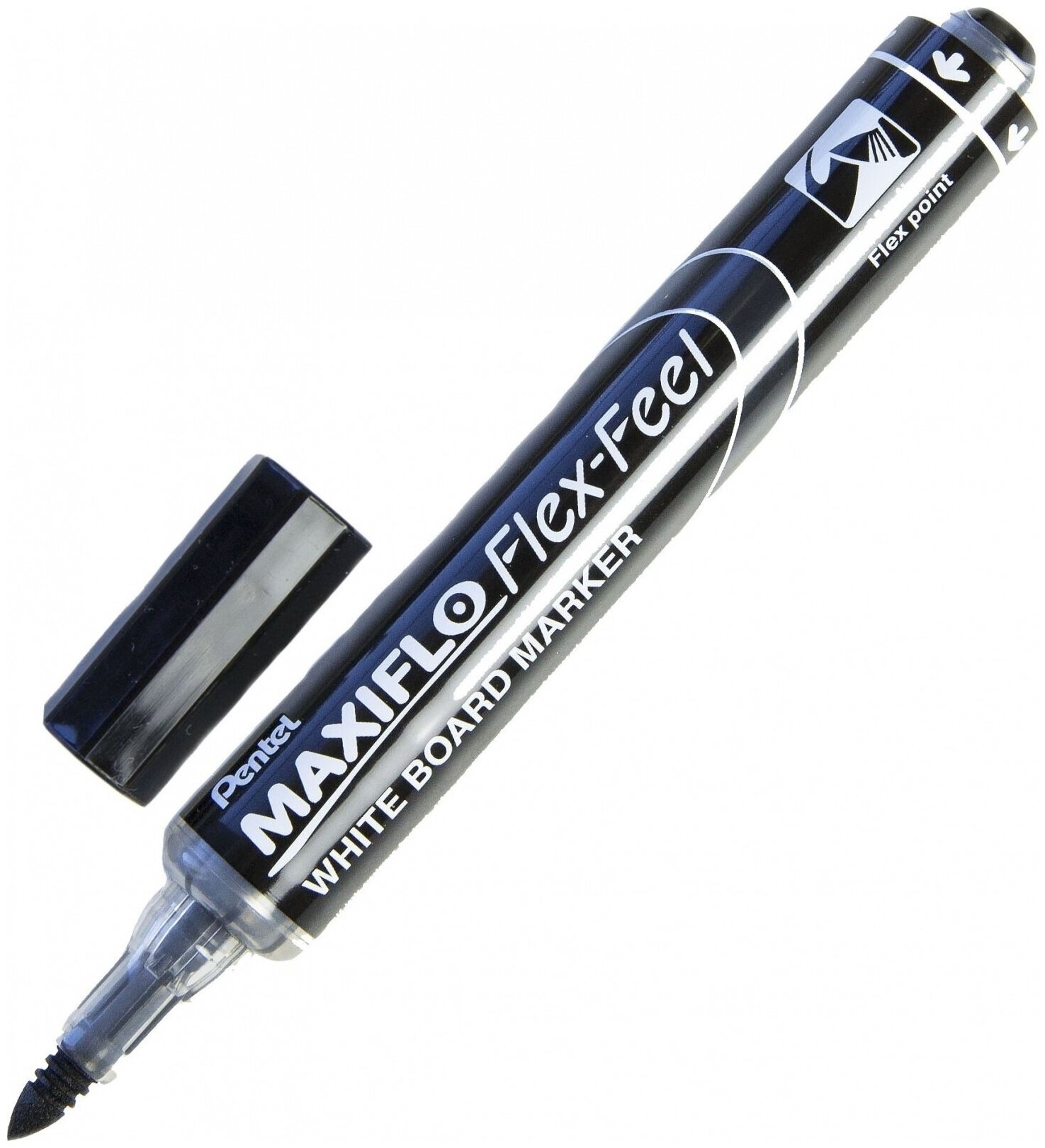 Маркер Pentel Maxiflo для белой доски с гибким пишущим узлом. Маркер отличается от своих аналогов c самостоятельной подачей чернил. На вершине корпуса находится кнопка-помпа, при нажатии на которую чернила к пишущему узлу подаются порционно. Такое решение позволило получить максимально экономичный и долговечный продукт с увеличенной длиной линии. Чернила можно подкачать в любой момент, когда это нужно, а фибровый пишущий узел не засыхает даже в открытом состоянии.