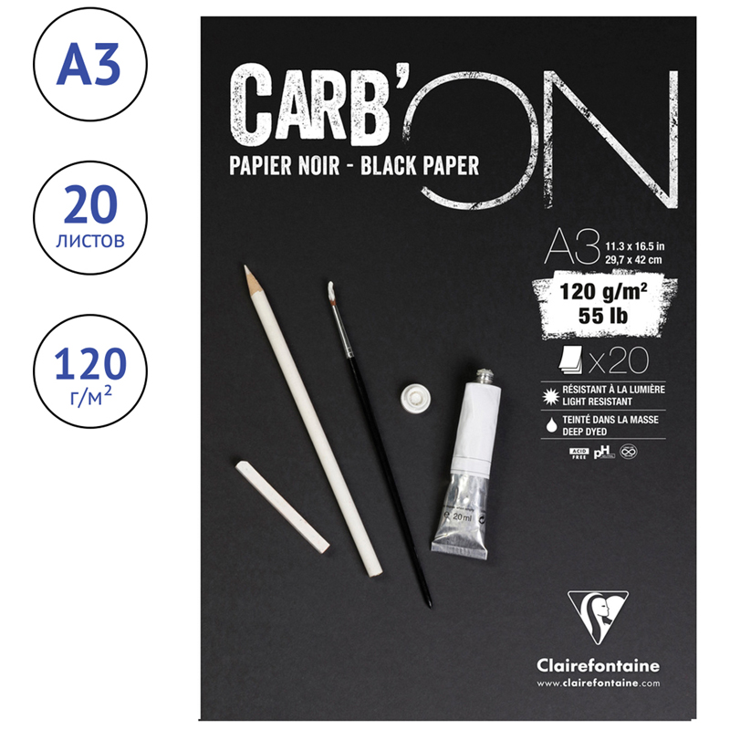 Скетчбук-блокнот Clairefontaine серии Carb'ON А3 размером 297*420 мм состоит из 20 листов. Подходит для сухих методов рисования: карандаш, фломастер, мел, сангина, пастель, пигментированный маркер. Внутренний блок — чёрная светостойкая мелокзернистая бумага, тонированная в массе, плотностью 120 г/м2. Черный блок позволяет выполнять зарисовки белыми чернилами или гуашью, что придаст дополнительный контраст вашему рисунку. Серия представлена скетчбуками разных форматов.