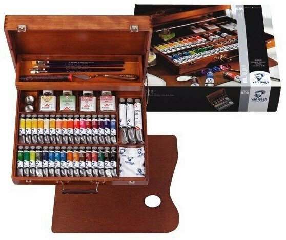 Комплектация набора: в данный набор входит 24 цвета масляной краски Van Gogh в тубах по 20 мл, 2 цвета (титановые и цинковые белила) в тубах по 60 мл, медиум для масляных красок, уайт-спирит без запаха, глянцевый лак, плоская кисть №10 из свиной щетины, круглая кисть №4 из свиной щетины, плоская синтетическая кисть №12, мастихин, уголь (3 шт), двойная масленка, деревянная палитра, салфетка. Набор упакован в подарочный ящик из темного дерева.