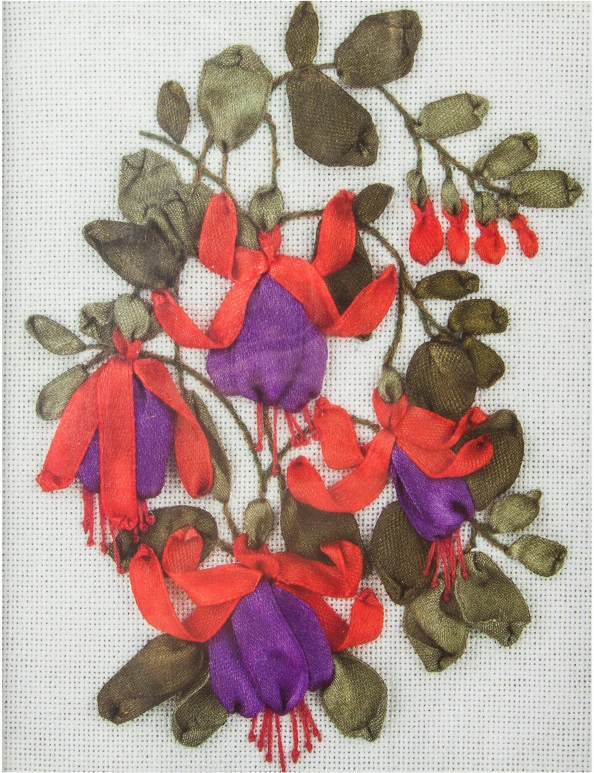 Состав набора: ткань-габардин с напечатанным рисунком, шелковые ленты "Gamma" и хлопчатобумажные нитки мулине "Gamma" на держателе, игла с широким ушком для вышивания лентами "Gamma", игла для вышивания мулине "Gamma", подробная пошаговая инструкция с цветными фотографиями.