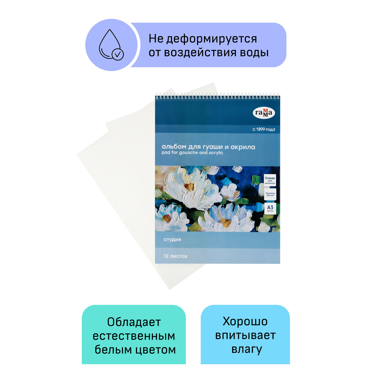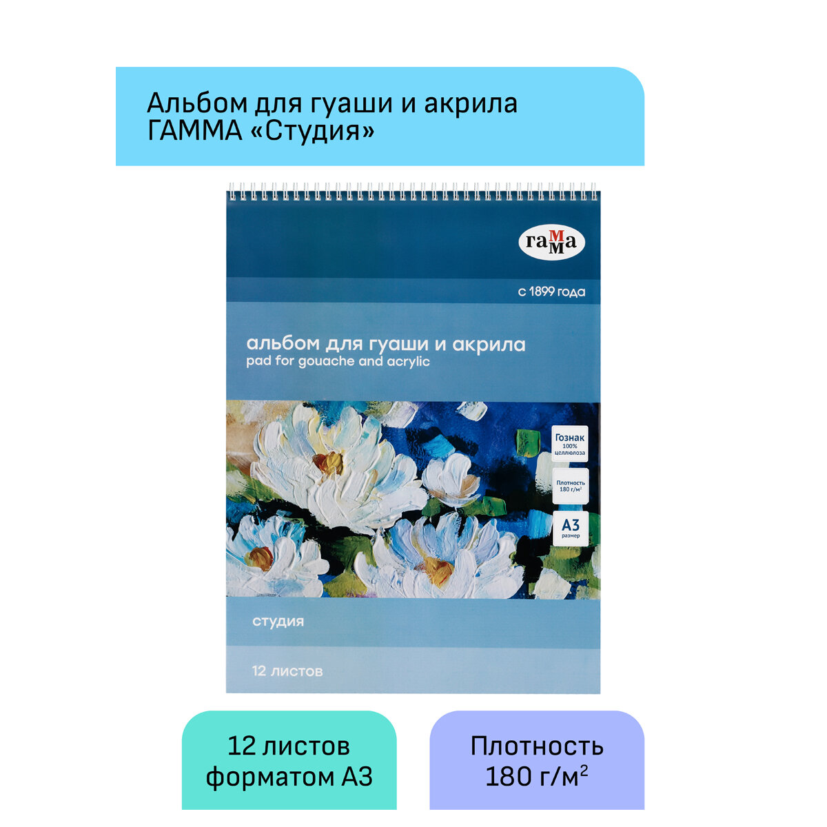 Альбом для гуаши и акрила на спирали Гамма "Студия" А3 12 л 180 г (ГМ-30A01S712W)