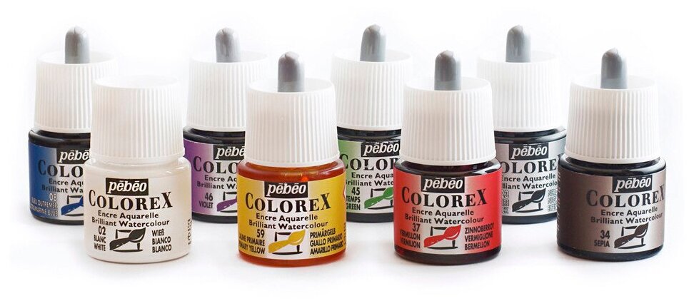 О серии: высококонцентрированные акварельные чернила Colorex выпускаются во флаконах с капельницей по 45 мл и в банках по 250 мл и 1 л. Количество цветов в серии 60.