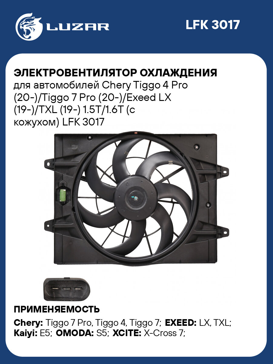 Электровентилятор охлаждения для автомобилей Chery Tiggo 4 (17-)/Tiggo 7 Pro (20-)/EXEED LX (19-)/TXL (19-) 1.5T/1.6T (с кожухом) LUZAR (LFK 3017)