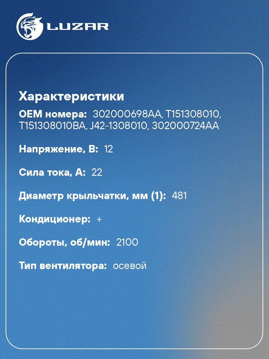 Электровентиляторы охлаждения LUZAR – это электродвигатель в сборе с крыльчаткой, который обеспечивает циркуляцию потока воздуха сквозь радиатор охлаждения, что обеспечивает лучший отвод тепла от охлаждающей жидкости внутри радиатора. Поток воздуха направляется вдоль оси двигателя. Производимые вентиляторы охлаждения соответствуют требованиям нормативам заводов-изготовителей по аэродинамическим свойствам и техническим параметрам.