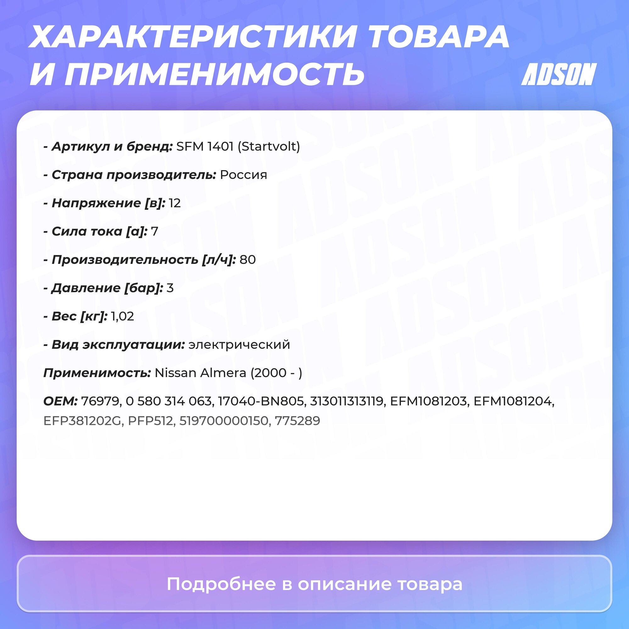 Исследуйте вершины надежности с STARTVOLT!Пришло время подарить вашему автомобилю именно то, что он заслуживает — лучшее из лучших. Познакомьтесь с тщательно разработанной автозапчастью Модуль топливного насоса для а/м Nissan Almera N16 (02-) 1.5i/1.8i, которая станет основой для долгой и беспроблемной работы вашего автомобиля. С артикулом SFM1401 , эта деталь станет залогом уверенности в каждой поездке.Почему стоит выбрать именно STARTVOLT? Потому что это символ качества и инноваций. Каждый элемент автозапчасти разрабатывается с учётом самых строгих стандартов и проходит тщательное тестирование, чтобы вы могли наслаждаться плавной и безопасной ездой без всяких компромиссов.Эта запчасть создана из высококачественных материалов, что гарантирует долговечность и устойчивость к износу. Спроектированная для идеальной совместимости, она легко устанавливается и безупречно функционирует в системе вашего авто.Актуальные технологии производства и постоянное совершенствование позволяют STARTVOLT быть впереди. Мы стремимся к тому, чтобы каждый клиент был удовлетворен и стал частью нашей большой семьи ценителей качества и инноваций.Почувствуйте уверенность на дороге с Модуль топливного насоса для а/м Nissan Almera N16 (02-) 1.5i/1.8i от STARTVOLT. Порадуйте свой автомобиль превосходным сервисом и убедитесь в бескомпромиссной надежности, которую мы предлагаем. Ваш комфорт и безопасность — наш приоритет! Не упустите шанс улучшить ваше авто с лучшей автозапчастью. Вы достойны только самого лучшего!