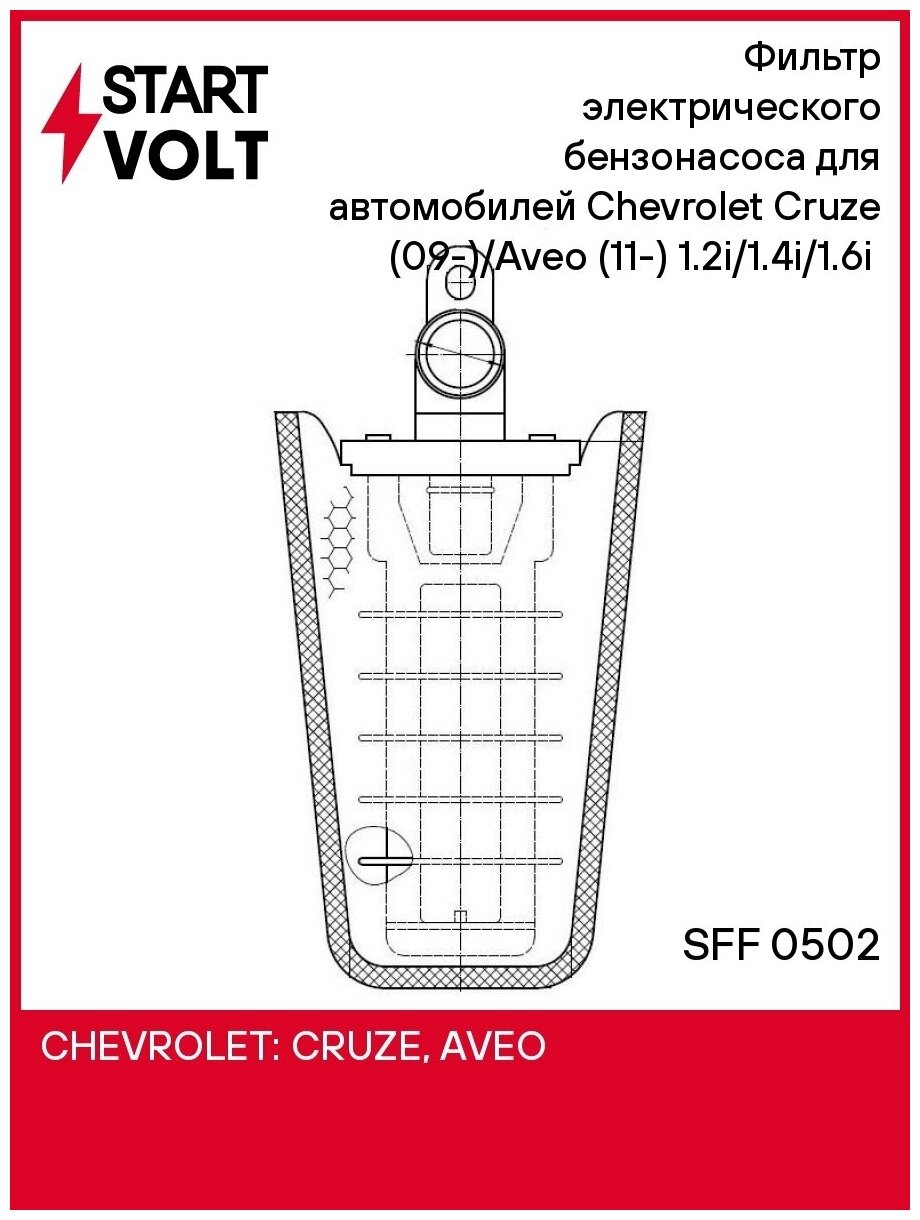 Сервис сравнения цен СкидкаГИД предлагает сравнить цены на товар «Фильтр электрического бензонасоса для автомобилей Chevrolet Cruze (09-)/Aveo (11-) 1.2i/1.4i/1.6i (D=109мм) StartVolt (SFF 0502)»