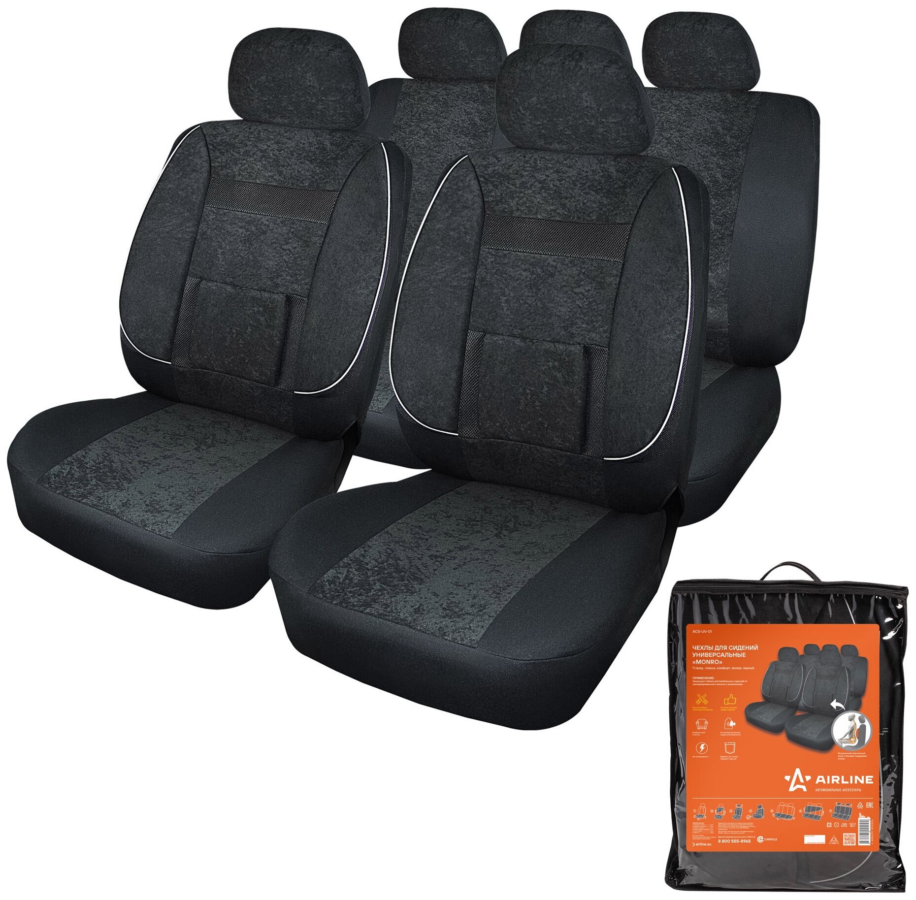 Чехлы для сидений универсальные "MONRO" 11 пред. повыш. комфорт велюр черн. AIRLINE (ACS-UV-01) (размер: универсальный)