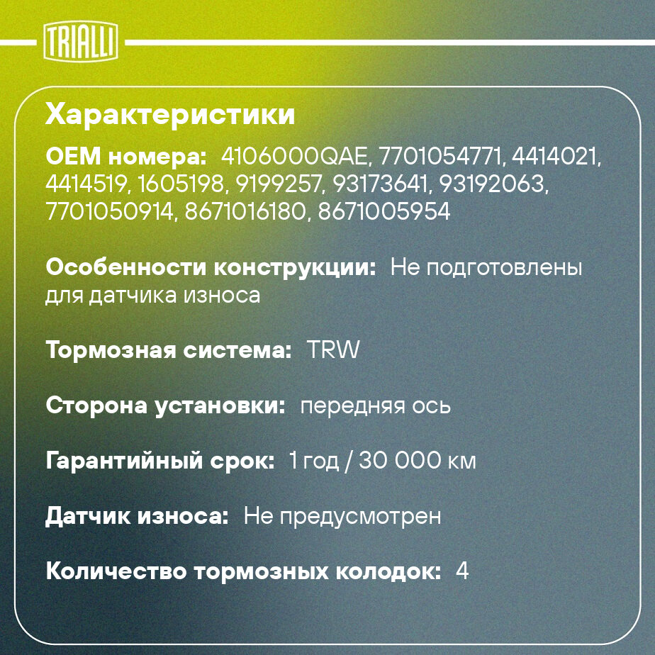 Колодки тормозные дисковые PF 0914 TRIALLI для Renault Trafic II 01˃ — это надёжное решение для эффективного и безопасного торможения в любых дорожных условиях. Предназначены для замены изношенных тормозных колодок, обеспечивают стабильное прижатие к тормозному диску, минимизируя риск проскальзывания и сокращая тормозной путь. Основные преимущества тормозных дисковых колодок TRIALLI: Высокая износостойкость — увеличенный срок службы за счёт применения современных фрикционных материалов. Стабильная работа при перепадах температур — эффективное торможение как в городском цикле, так и на трассе. Низкий уровень шума и вибраций — специальное покрытие и демпфирующие пластины обеспечивают тихую и плавную работу. Минимальное образование пыли — сохраняет чистоту дисков. Быстрое приработочное торможение — достигается эффективное сцепление уже с первых километров после установки. Продукция TRIALLI разрабатывается с учётом международных стандартов безопасности и проходит многоэтапный контроль качества на всех стадиях производства. При производстве используются передовые технологии, что позволяет обеспечивать стабильные эксплуатационные характеристики даже в сложных климатических условиях. Для достижения максимальной эффективности рекомендуется заменять тормозные колодки TRIALLI парами на одной оси. Перед установкой убедитесь в отсутствии повреждений на тормозных дисках и при необходимости выполните их шлифовку или замену. После монтажа новых колодок соблюдайте режим приработки: избегайте резких торможений в первые 200–300 км, чтобы обеспечить равномерное прилегание фрикционного материала к диску. Регулярно проверяйте уровень тормозной жидкости и состояние направляющих суппортов для предотвращения закисания и неравномерного износа.