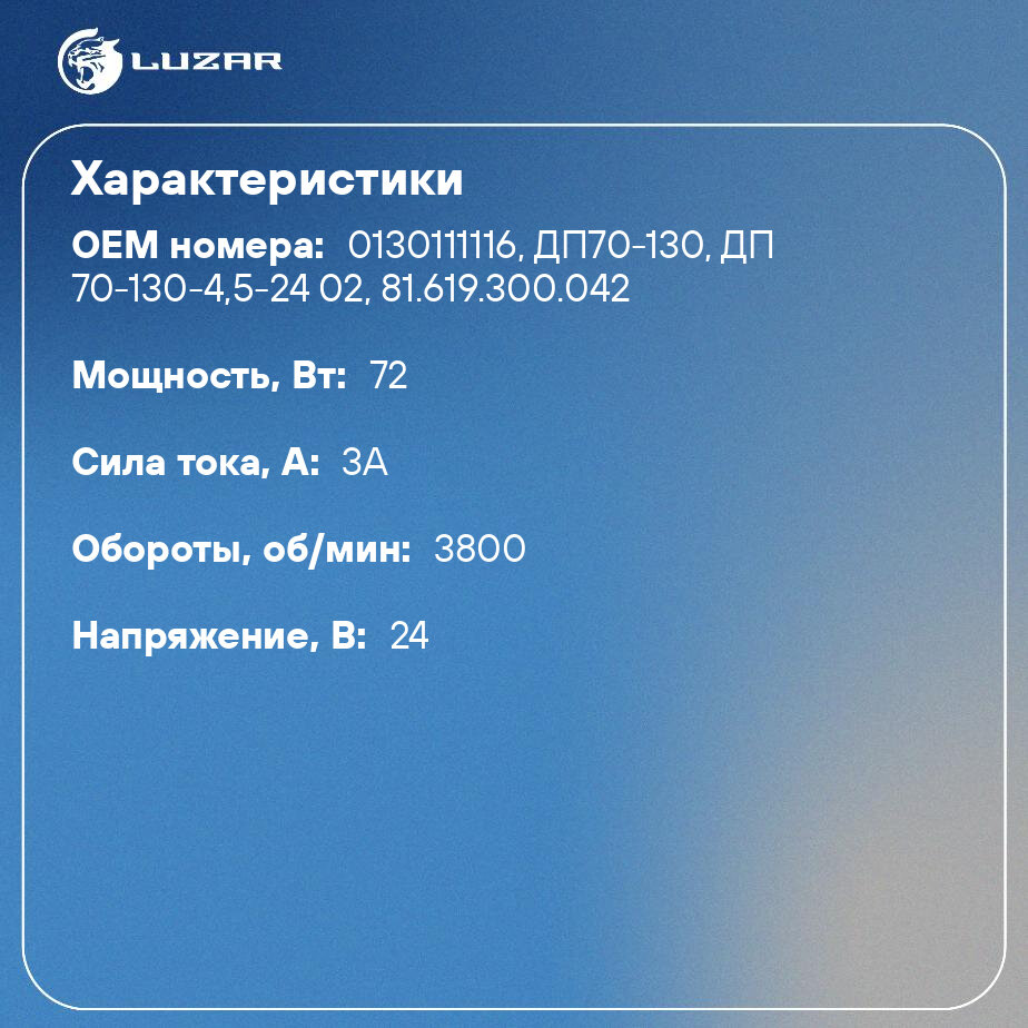 Вентилятор отопителя LUZAR обеспечивает максимально быструю циркуляцию воздуха. Вентиляторы состоят из электрического привода и пластиковой крыльчатки, устанавливаются в корпус отопителя в салоне автомобиля. У вентиляторов отопителя усовершенствованная конструкция лопастей вентилятора для высокой скорости работы и подачи большего объема воздуха. У вентиляторов отопителя откалиброваная крыльчатка, поэтому уровень шума до 50% ниже, чем у аналогов. Вал электродвигателя вентиляторов LUZAR имеют два плавающих подшипника, что снижает трение и исключает биение вала.