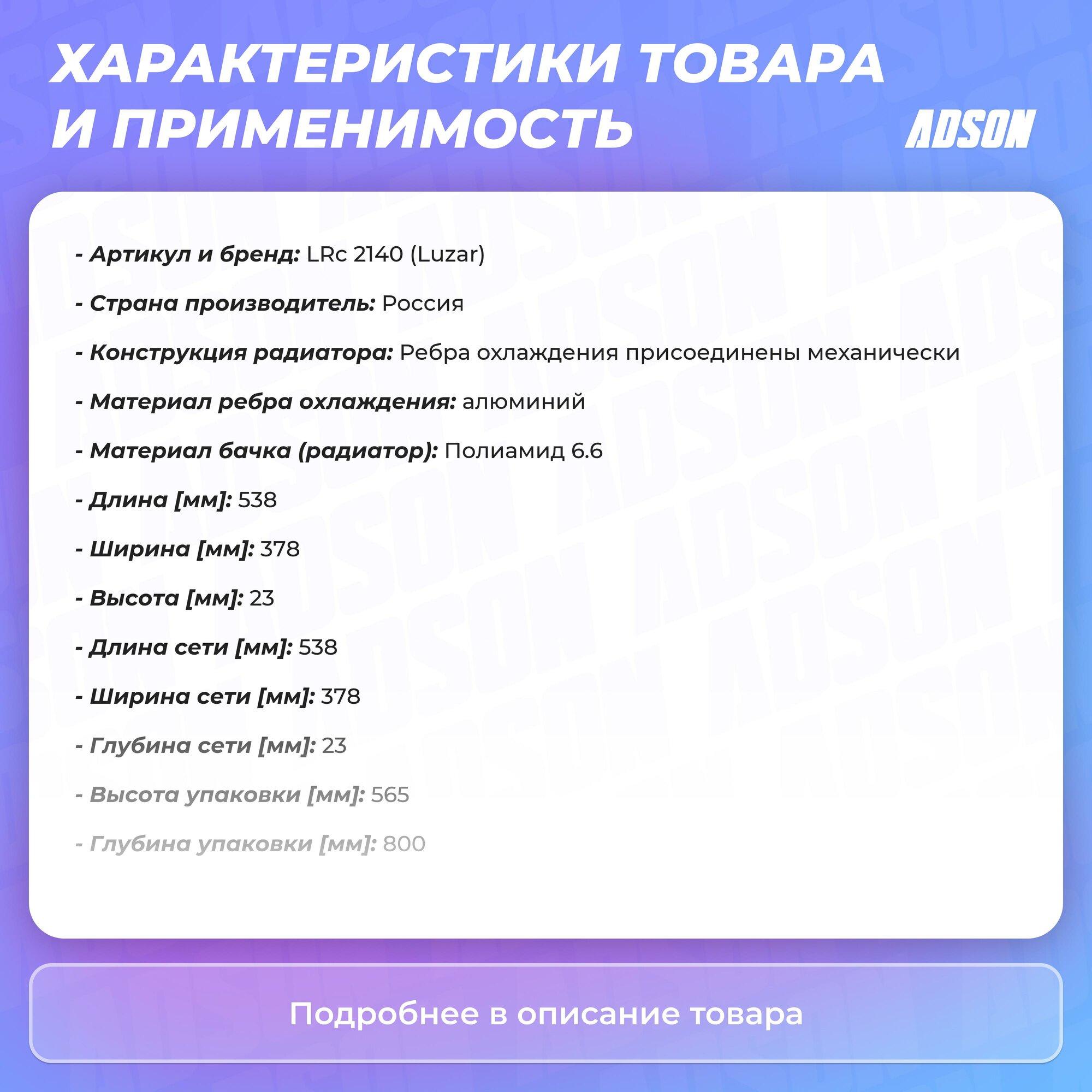 Внимание ! Цена указывается за 1 единицу товара!Вы Смотрите :Номер товара : LRC2140 Производитель : LUZAR Название товара : Радиатор охлаждения Доступно для заказа : 4 Минимальное количество для заказа : 1 - заказывать кратно данному числу !Внимание!Делаем отправку заказа максимум через 2 дня после заказа, в зависимости от дня недели.Цена указана за 1шт, если указывается кол-во в лоте 10, то нужно заказывать 10шт, по 1шт данный товар не отправляемНапример:Cвечи продаются по 4шт(6,8,12) минимум и кратно 4шт(6,8,12)Втулки стабилизатора (которые одинаковые) по 2шт минимум и кратно 2шт, за исключением когда втулка идет на одну из сторон, то есть правая или левая!Пружины продаются по 2шт!