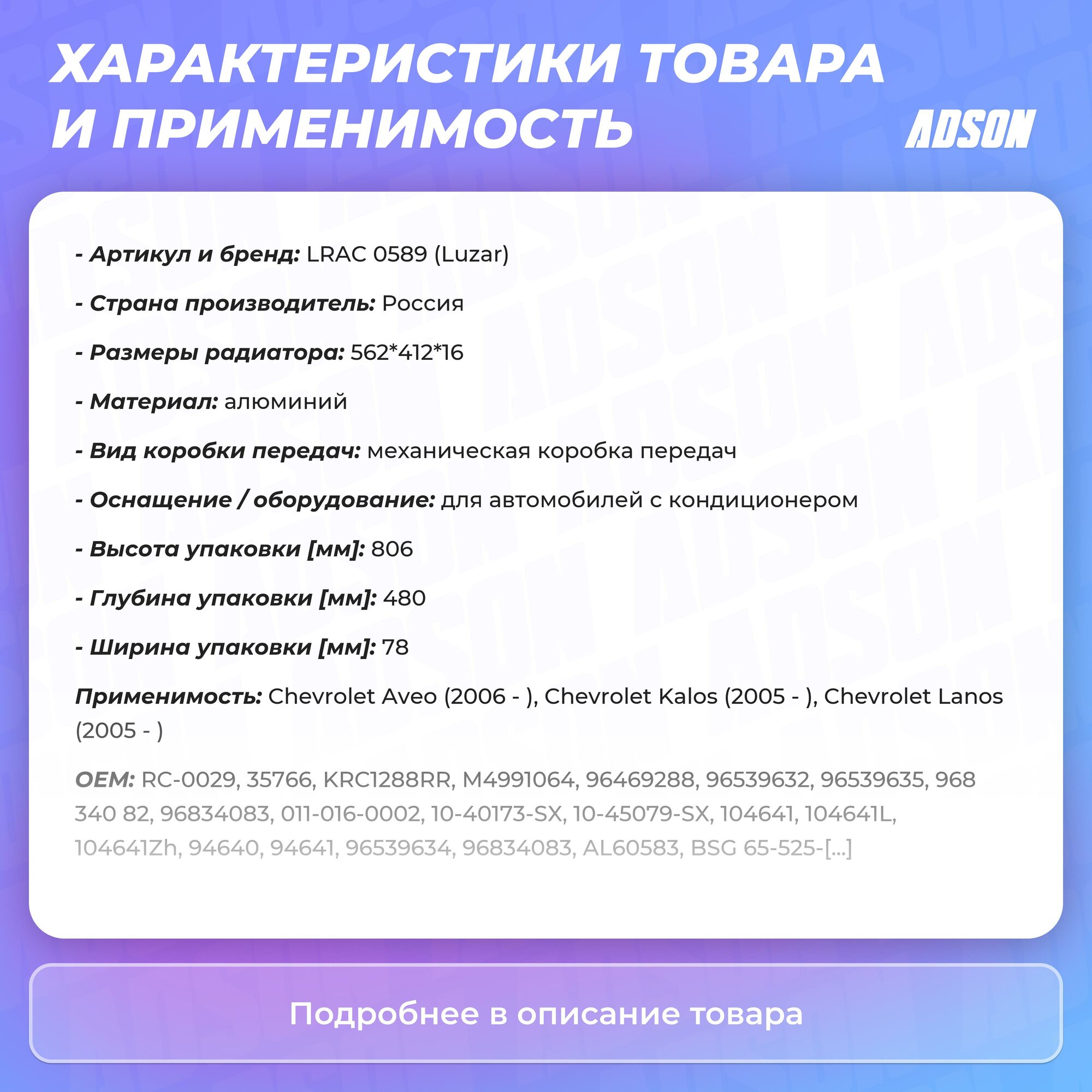 Сопутствующий товар: Радиаторы охлаждения: LRc 05180; LRc 0581; LRc CHAv05125; LRc CHAv05175; LRc CHAv05224; LRc CHAv05226; LRc 0502