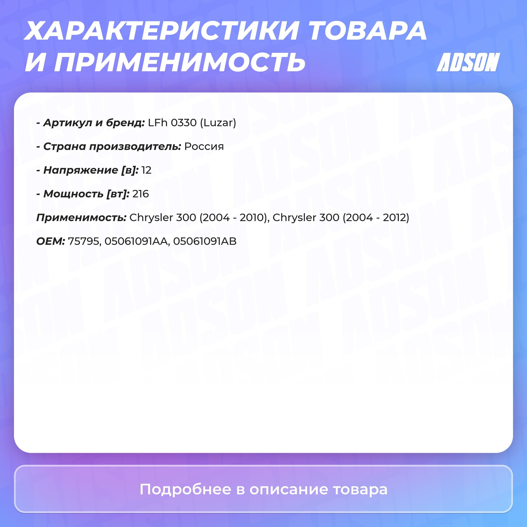 Сервис сравнения цен СкидкаГИД предлагает сравнить цены на товар «Электровентилятор отопителя для автомобилей 300C (04-) LUZAR (LFh 0330)»