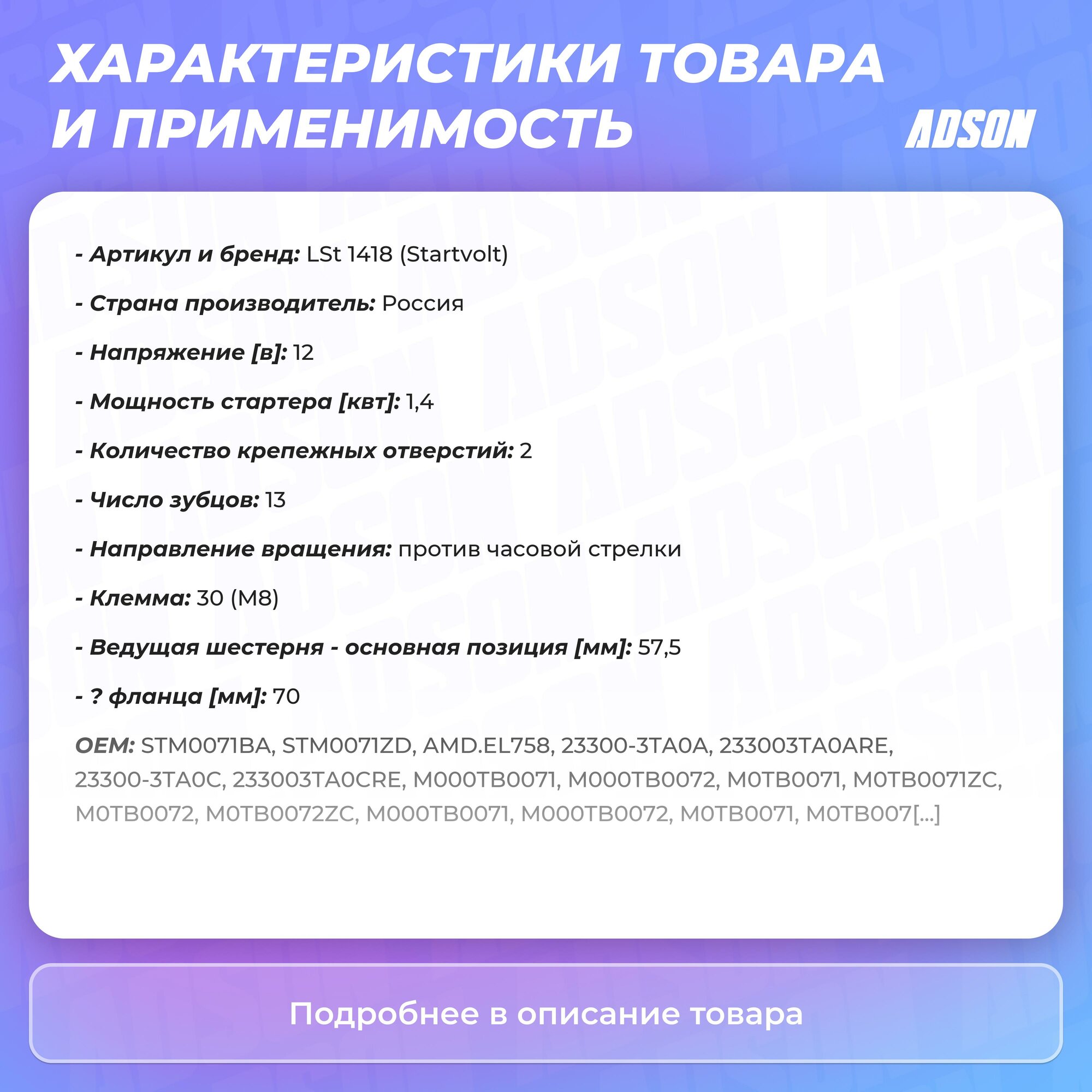Стартер для автомобилей Nissan X-Trail T32 (14-)/Teana L33 (14-) 2.5i 1,4кВт StartVOLT LSt 1418