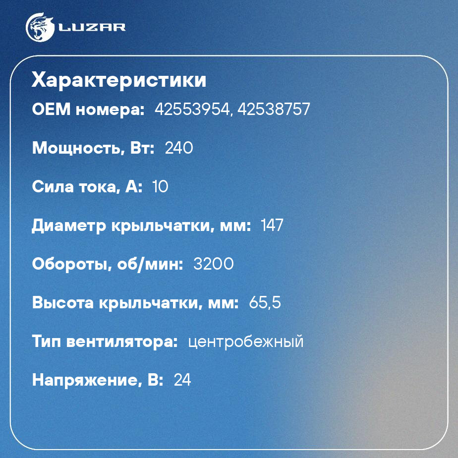Вентилятор отопителя LUZAR обеспечивает максимально быструю циркуляцию воздуха. Вентиляторы состоят из электрического привода и пластиковой крыльчатки, устанавливаются в корпус отопителя в салоне автомобиля. У вентиляторов отопителя усовершенствованная конструкция лопастей вентилятора для высокой скорости работы и подачи большего объема воздуха. У вентиляторов отопителя откалиброваная крыльчатка, поэтому уровень шума до 50% ниже, чем у аналогов. Вал электродвигателя вентиляторов LUZAR имеют два плавающих подшипника, что снижает трение и исключает биение вала.