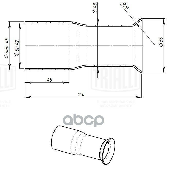 Соединитель труб глушителя - переходник d=45мм/R30/d=56мм L=120 (алюминизированная сталь) TRIALLI (EMP 453056)