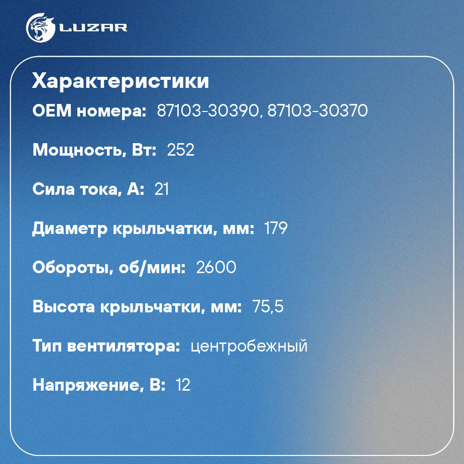 Вентилятор отопителя LUZAR обеспечивает максимально быструю циркуляцию воздуха. Вентиляторы состоят из электрического привода и пластиковой крыльчатки, устанавливаются в корпус отопителя в салоне автомобиля. У вентиляторов отопителя усовершенствованная конструкция лопастей вентилятора для высокой скорости работы и подачи большего объема воздуха. У вентиляторов отопителя откалиброваная крыльчатка, поэтому уровень шума до 50% ниже, чем у аналогов. Вал электродвигателя вентиляторов LUZAR имеют два плавающих подшипника, что снижает трение и исключает биение вала.
