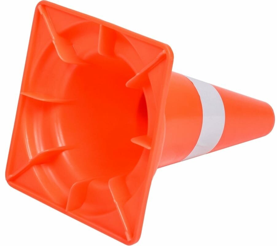 Конусы предназначены для регулировки движения транспорта и пешеходов, помогают водителям увидеть препятствия издалека и безопасно запланировать маневр, избежав аварии.