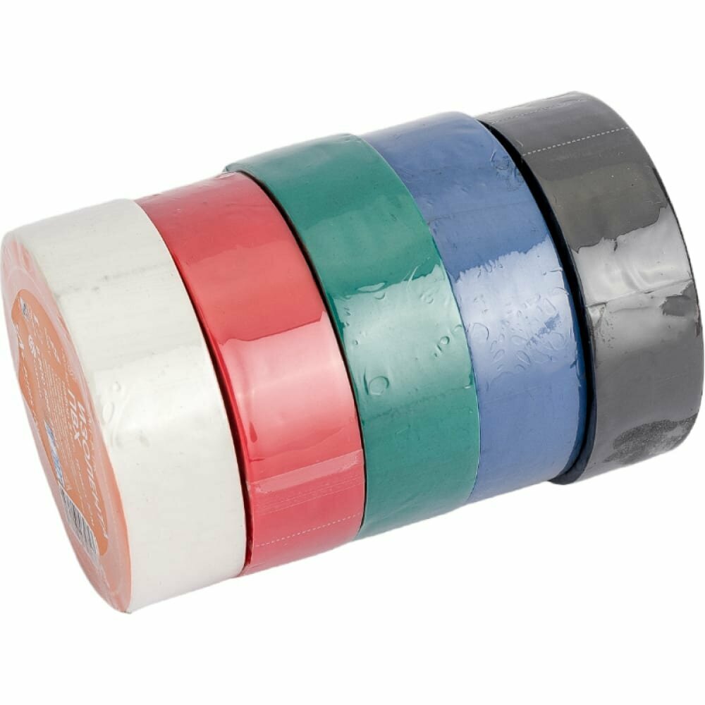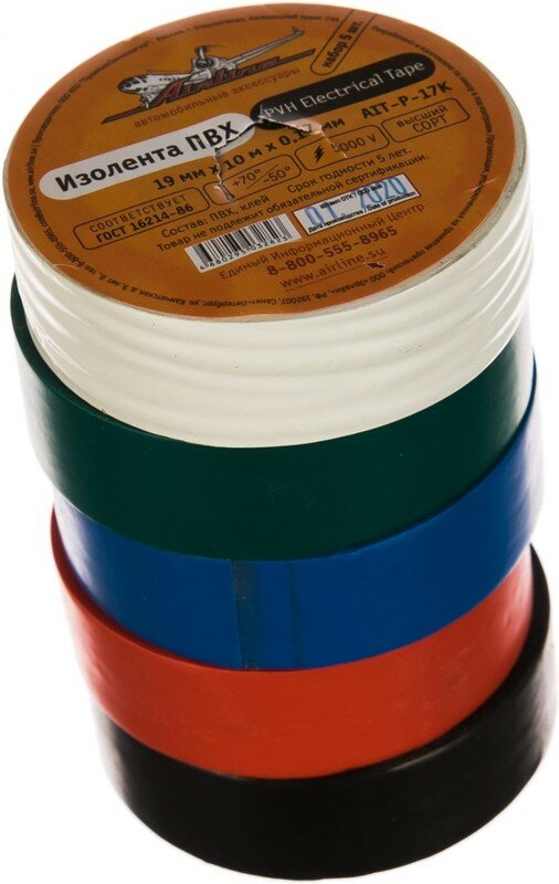 Изолента ПВХ набор 5 шт.(син.чёр.кр.зел. бел.) 19 мм*10 м AIRLINE (AIT-P-17K) (размер: 19мм*10м)