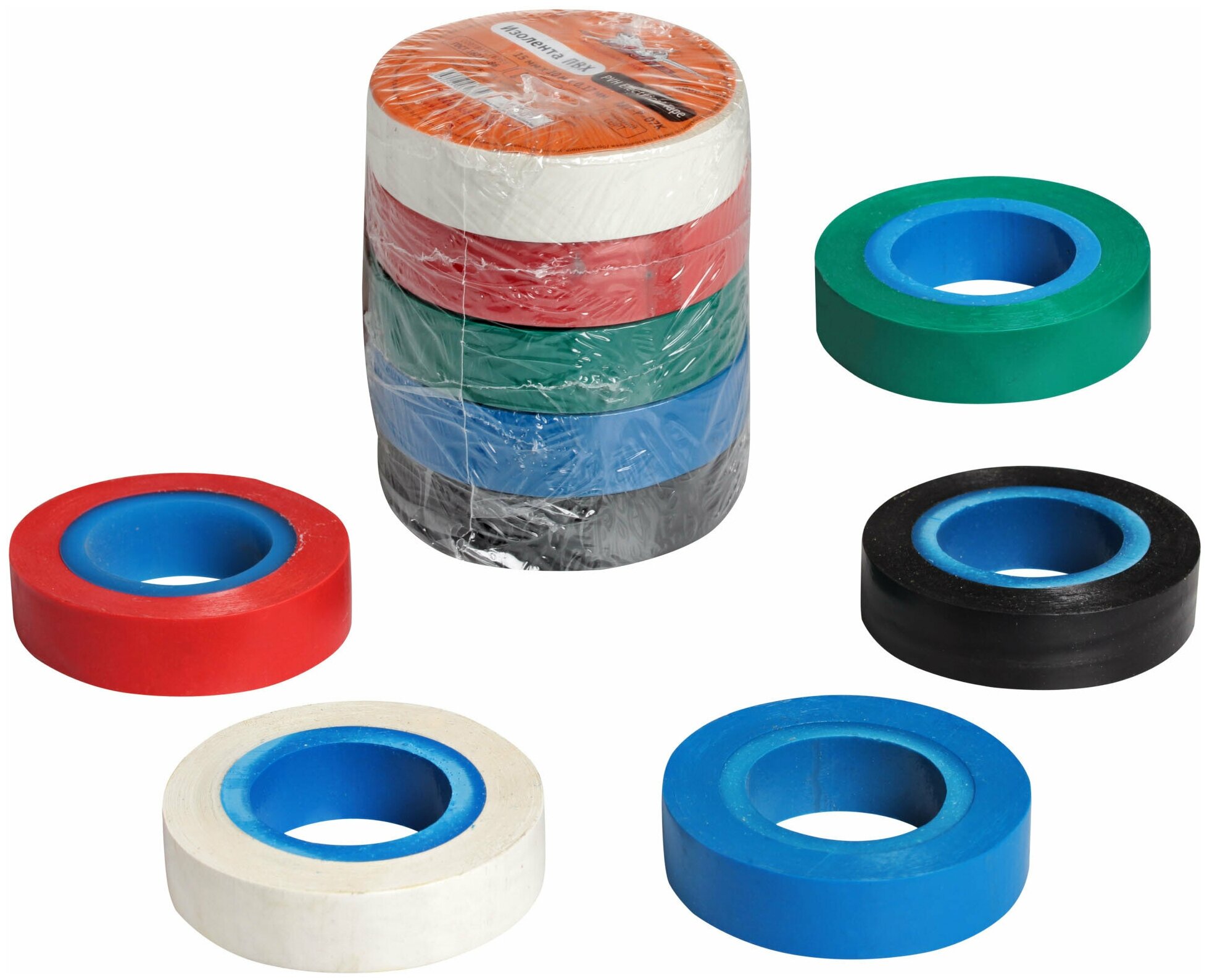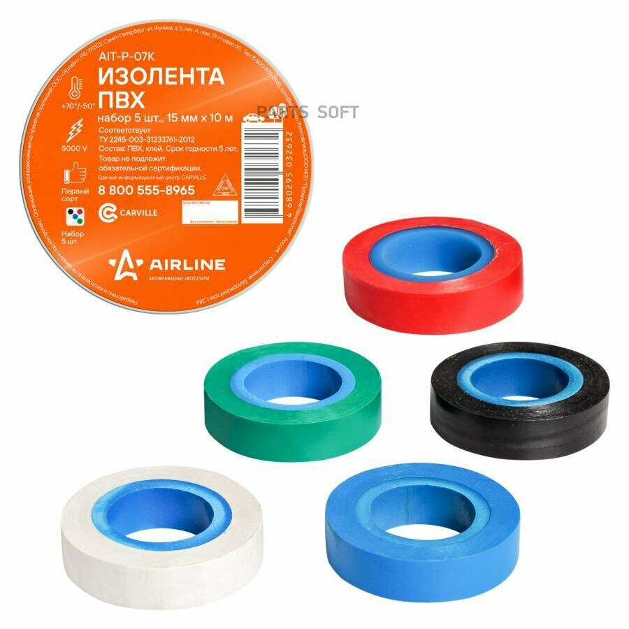 Изолента ПВХ набор 5 шт.(син.чёр.кр.зел. бел.) 15 мм*10 м AIRLINE (AIT-P-07K) (размер: 15мм*10м)