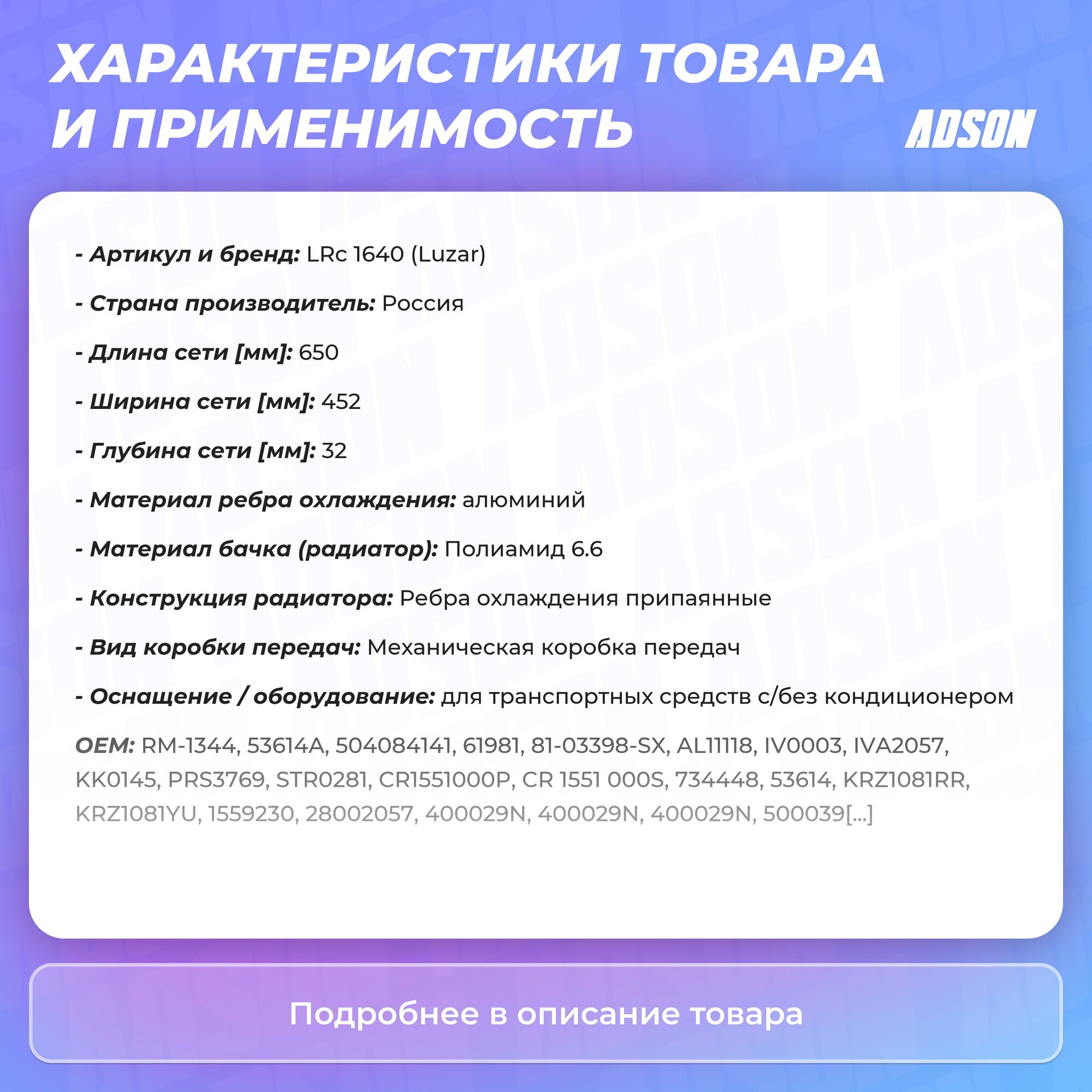 | Сопутствующий товар | Радиаторы кондиционера (конденсеры):LRAC 1664 |