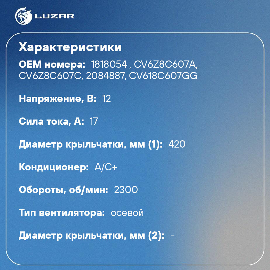 Электровентиляторы охлаждения LUZAR – это электродвигатель в сборе с крыльчаткой, который обеспечивает циркуляцию потока воздуха сквозь радиатор охлаждения, что обеспечивает лучший отвод тепла от охлаждающей жидкости внутри радиатора. Поток воздуха направляется вдоль оси двигателя. Производимые вентиляторы охлаждения соответствуют требованиям нормативам заводов-изготовителей по аэродинамическим свойствам и техническим параметрам.