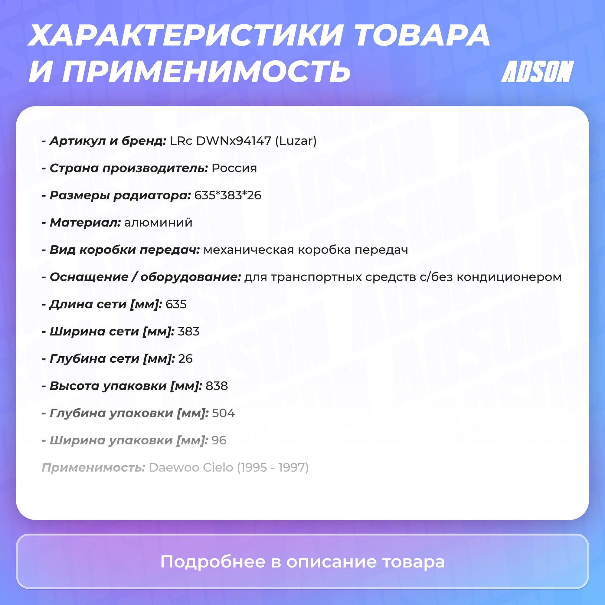 Исследуйте вершины надежности с LUZAR!Пришло время подарить вашему автомобилю именно то, что он заслуживает — лучшее из лучших. Познакомьтесь с тщательно разработанной автозапчастью Радиатор охл. для а/м Daewoo Nexia (94-) 1.5/1.8 MT (паяный) (LRc DWNx94147), которая станет основой для долгой и беспроблемной работы вашего автомобиля. С артикулом LRCDWNX94147 , эта деталь станет залогом уверенности в каждой поездке.Почему стоит выбрать именно LUZAR? Потому что это символ качества и инноваций. Каждый элемент автозапчасти разрабатывается с учётом самых строгих стандартов и проходит тщательное тестирование, чтобы вы могли наслаждаться плавной и безопасной ездой без всяких компромиссов.Эта запчасть создана из высококачественных материалов, что гарантирует долговечность и устойчивость к износу. Спроектированная для идеальной совместимости, она легко устанавливается и безупречно функционирует в системе вашего авто.Актуальные технологии производства и постоянное совершенствование позволяют LUZAR быть впереди. Мы стремимся к тому, чтобы каждый клиент был удовлетворен и стал частью нашей большой семьи ценителей качества и инноваций.Почувствуйте уверенность на дороге с Радиатор охл. для а/м Daewoo Nexia (94-) 1.5/1.8 MT (паяный) (LRc DWNx94147) от LUZAR. Порадуйте свой автомобиль превосходным сервисом и убедитесь в бескомпромиссной надежности, которую мы предлагаем. Ваш комфорт и безопасность — наш приоритет! Не упустите шанс улучшить ваше авто с лучшей автозапчастью. Вы достойны только самого лучшего!