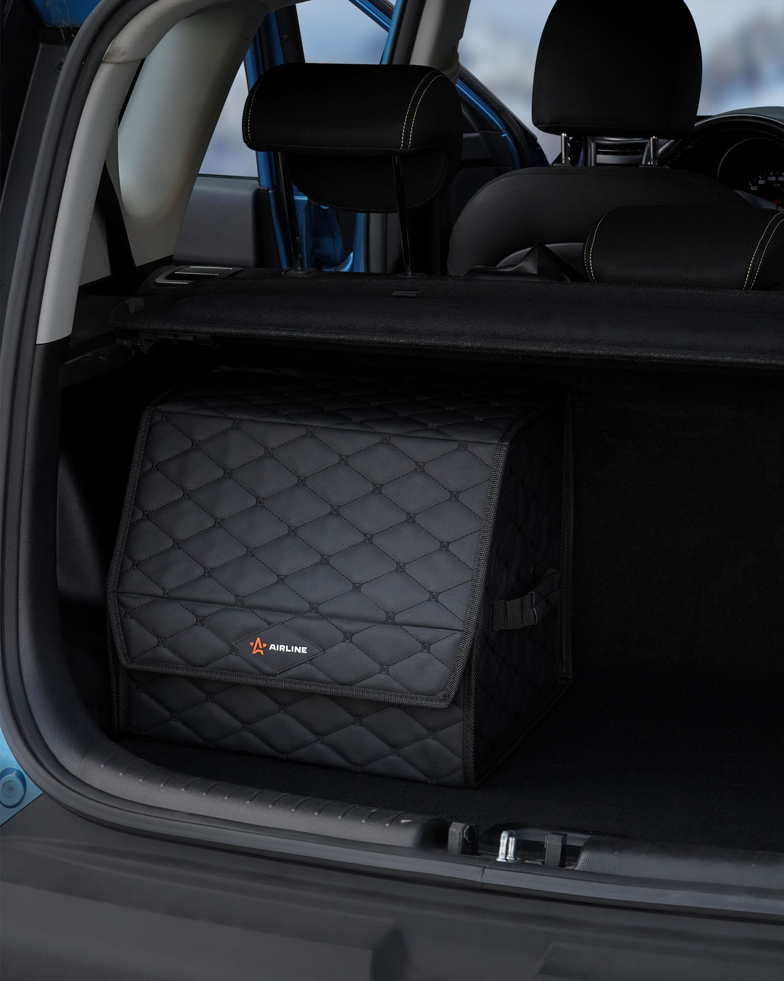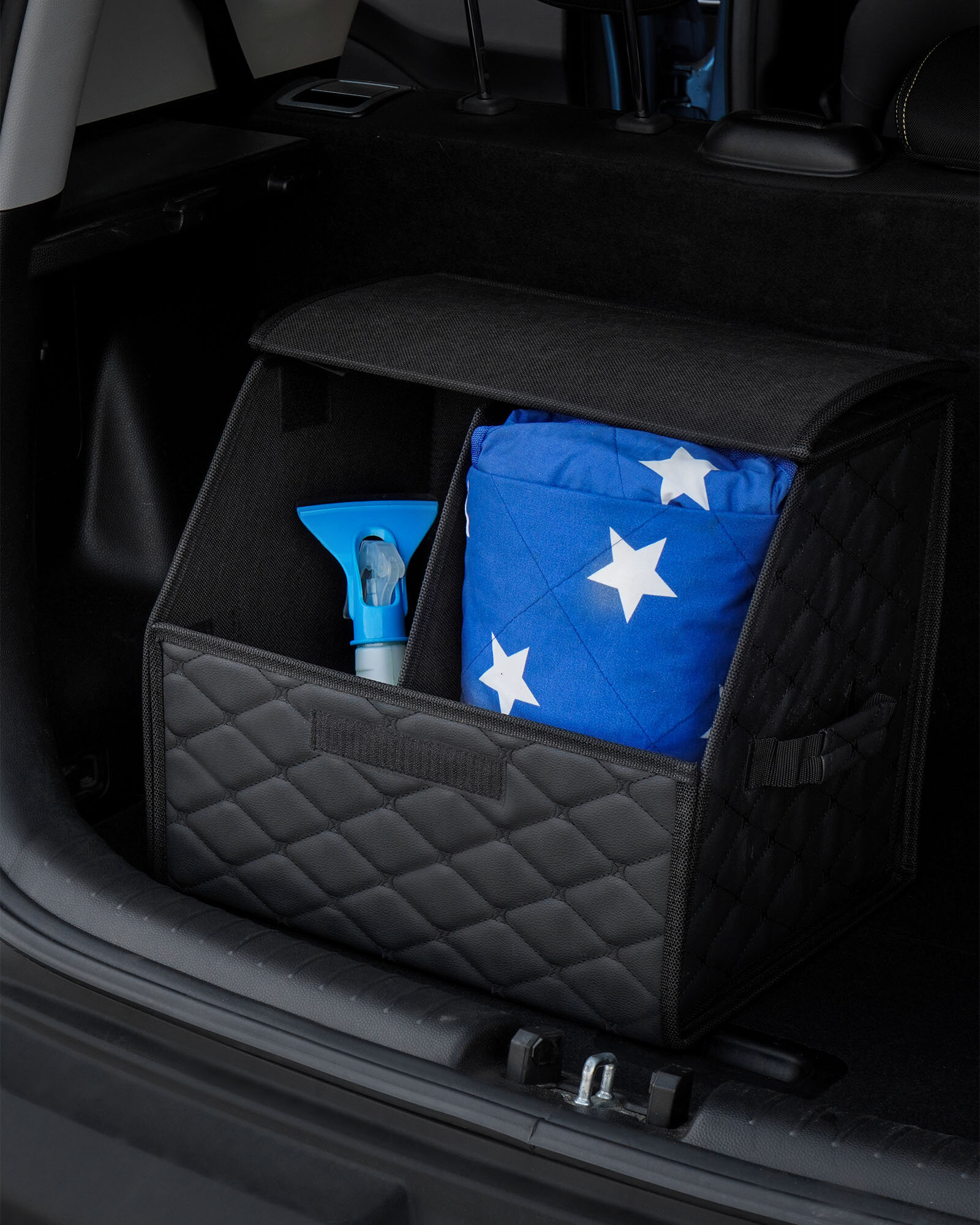 Органайзер предназначен для обеспечения порядка в багажнике автомобиля. Оснащён откидной крышкой и способен скрыть в себе 5л. бутылки или канистры, а также все необходимые в дороге вещи. Органайзер изготовлен из высококачественной экокожи, простёганной в виде ромба, что придает ему элегантный, богатый вид. Долговечность его складной конструкции придает внутренний листовой пластик. Внутри возможно установить перегородку для раздельного хранения вещей. По бокам расположены крепкие ручки для его переноски, а нижняя и задняя липучка надежно зафиксирует его к ворсовому покрытию багажника.