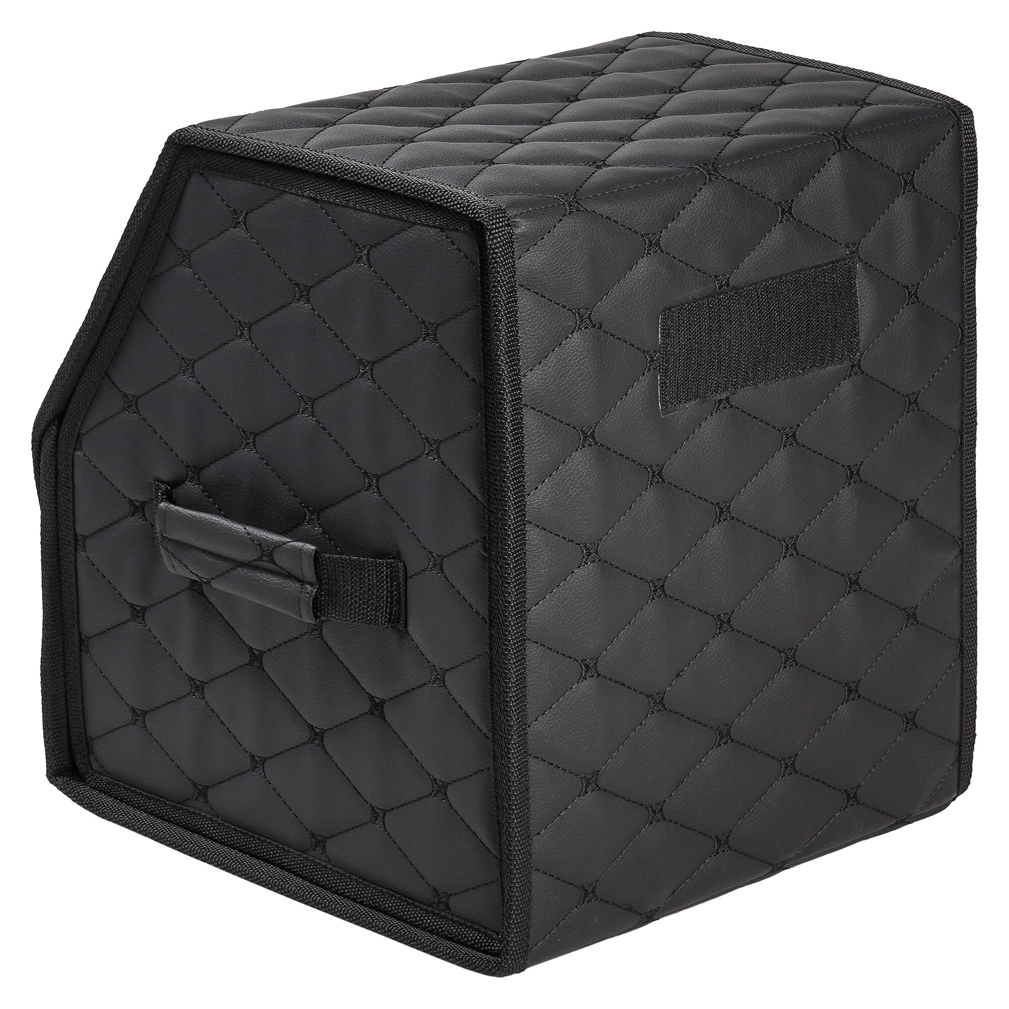 Органайзер предназначен для обеспечения порядка в багажнике автомобиля. Оснащён откидной крышкой и способен скрыть в себе 5л. бутылки или канистры, а также все необходимые в дороге вещи. Органайзер изготовлен из высококачественной экокожи, простёганной в виде ромба, что придает ему элегантный, богатый вид. Долговечность его складной конструкции придает внутренний листовой пластик. По бокам расположены крепкие ручки для его переноски, а нижняя и задняя липучка надежно зафиксирует его к ворсовому покрытию багажника.