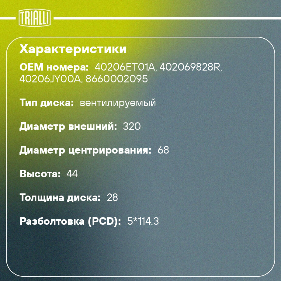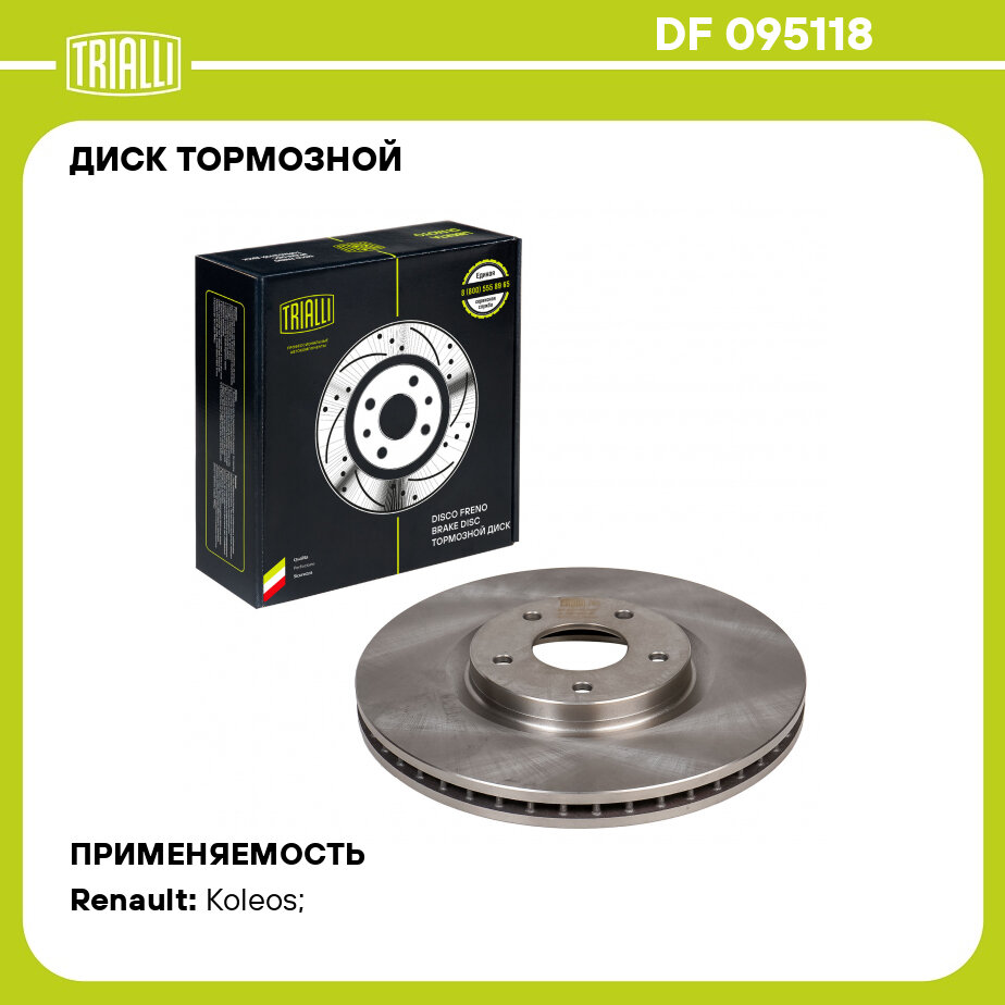 Тормозные диски TRIALLI DF 095118 для Nissan Qashqai, Renault Koleos 2.5/1.6D/2 обеспечивают эффективное торможение за счёт стабильного контакта с колодками. Разработаны для обеспечения надежного, стабильного и безопасного торможения в различных дорожных условиях.