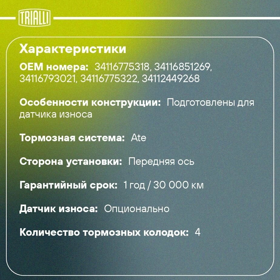 Колодки тормозные дисковые PF 4186 TRIALLI для BMW 5 GT F07 09˃ — это надёжное решение для эффективного и безопасного торможения в любых дорожных условиях. Предназначены для замены изношенных тормозных колодок, обеспечивают стабильное прижатие к тормозному диску, минимизируя риск проскальзывания и сокращая тормозной путь. Основные преимущества тормозных дисковых колодок TRIALLI: Высокая износостойкость — увеличенный срок службы за счёт применения современных фрикционных материалов. Стабильная работа при перепадах температур — эффективное торможение как в городском цикле, так и на трассе. Низкий уровень шума и вибраций — специальное покрытие и демпфирующие пластины обеспечивают тихую и плавную работу. Минимальное образование пыли — сохраняет чистоту дисков. Быстрое приработочное торможение — достигается эффективное сцепление уже с первых километров после установки. Продукция TRIALLI разрабатывается с учётом международных стандартов безопасности и проходит многоэтапный контроль качества на всех стадиях производства. При производстве используются передовые технологии, что позволяет обеспечивать стабильные эксплуатационные характеристики даже в сложных климатических условиях. Для достижения максимальной эффективности рекомендуется заменять тормозные колодки TRIALLI парами на одной оси. Перед установкой убедитесь в отсутствии повреждений на тормозных дисках и при необходимости выполните их шлифовку или замену. После монтажа новых колодок соблюдайте режим приработки: избегайте резких торможений в первые 200–300 км, чтобы обеспечить равномерное прилегание фрикционного материала к диску. Регулярно проверяйте уровень тормозной жидкости и состояние направляющих суппортов для предотвращения закисания и неравномерного износа.