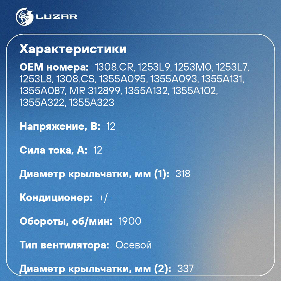 Электровентиляторы охлаждения LUZAR – это электродвигатель в сборе с крыльчаткой, который обеспечивает циркуляцию потока воздуха сквозь радиатор охлаждения, что обеспечивает лучший отвод тепла от охлаждающей жидкости внутри радиатора. Поток воздуха направляется вдоль оси двигателя. Производимые вентиляторы охлаждения соответствуют требованиям нормативам заводов-изготовителей по аэродинамическим свойствам и техническим параметрам.