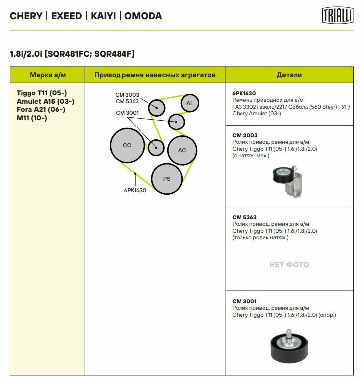 Ролик приводного ремня с натяжным механизмом для автомобилей Chery Tiggo (06-) 1.6i/1.8i/2.0i генератора TRIALLI CM 3003