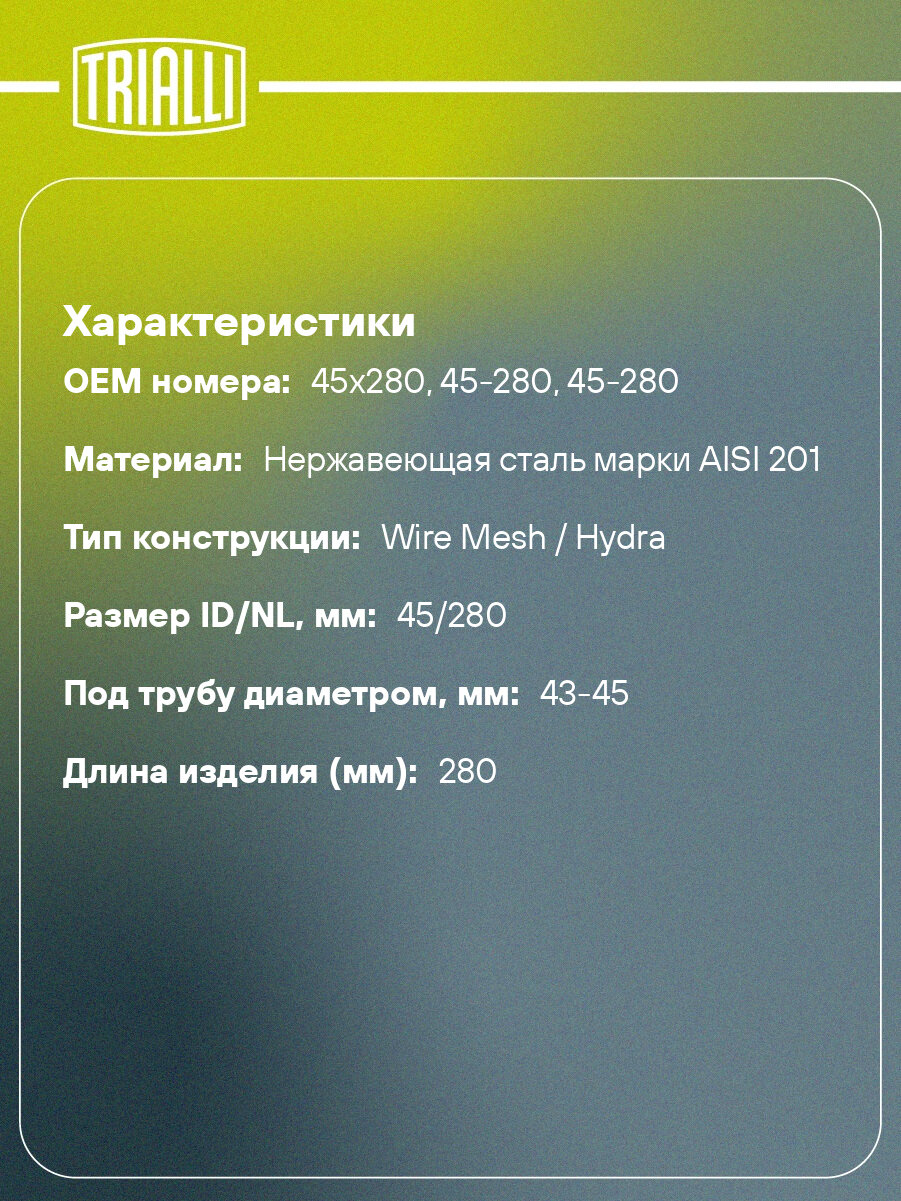 Сервис сравнения цен СкидкаГИД предлагает сравнить цены на товар «Виброкомпенсатор выхлопной трубы (Гофра) 45x280 Hydra/Wire Mesh (нерж. сталь) TRIALLI (FT 0009)»