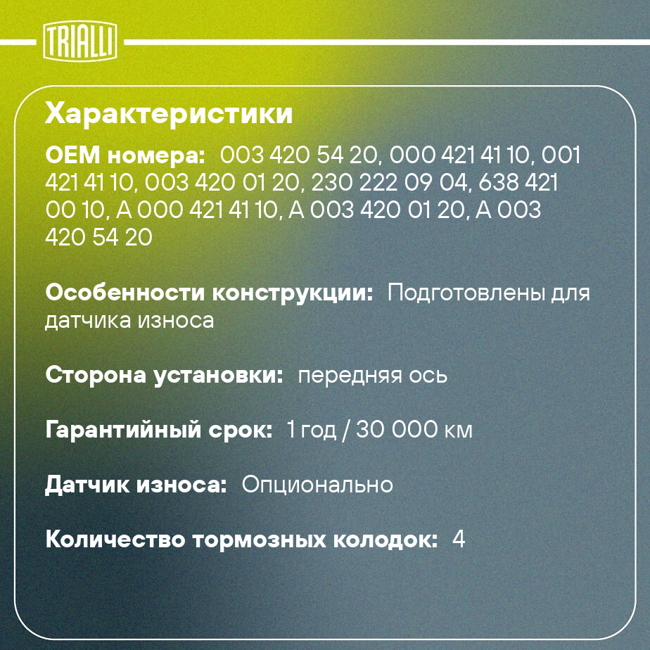 Колодки тормозные дисковые PF 1502 TRIALLI для MB Vito 2.0i/2.3i/2.2CDi/2.3D/CDi 98˃ — это надёжное решение для эффективного и безопасного торможения в любых дорожных условиях. Предназначены для замены изношенных тормозных колодок, обеспечивают стабильное прижатие к тормозному диску, минимизируя риск проскальзывания и сокращая тормозной путь. Основные преимущества тормозных дисковых колодок TRIALLI: Высокая износостойкость — увеличенный срок службы за счёт применения современных фрикционных материалов. Стабильная работа при перепадах температур — эффективное торможение как в городском цикле, так и на трассе. Низкий уровень шума и вибраций — специальное покрытие и демпфирующие пластины обеспечивают тихую и плавную работу. Минимальное образование пыли — сохраняет чистоту дисков. Быстрое приработочное торможение — достигается эффективное сцепление уже с первых километров после установки. Продукция TRIALLI разрабатывается с учётом международных стандартов безопасности и проходит многоэтапный контроль качества на всех стадиях производства. При производстве используются передовые технологии, что позволяет обеспечивать стабильные эксплуатационные характеристики даже в сложных климатических условиях. Для достижения максимальной эффективности рекомендуется заменять тормозные колодки TRIALLI парами на одной оси. Перед установкой убедитесь в отсутствии повреждений на тормозных дисках и при необходимости выполните их шлифовку или замену. После монтажа новых колодок соблюдайте режим приработки: избегайте резких торможений в первые 200–300 км, чтобы обеспечить равномерное прилегание фрикционного материала к диску. Регулярно проверяйте уровень тормозной жидкости и состояние направляющих суппортов для предотвращения закисания и неравномерного износа.
