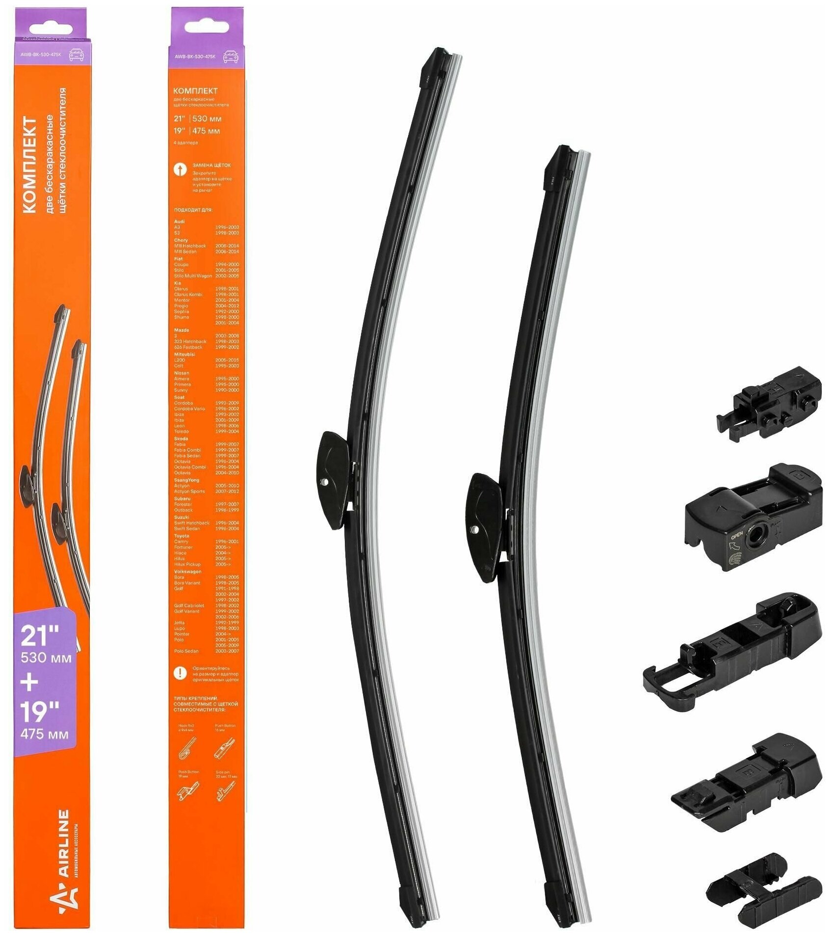 Щетки стеклоочистителя 530/475мм (21"/19") бескаркасныеPolo 01/09 Golf 91/04Forester 97/07L200 05/15 Mazda 3 03/08 2 шт. 4 типа адптр AIRLINE (AWB-BK-530-475K) (размер: 530/475 мм)