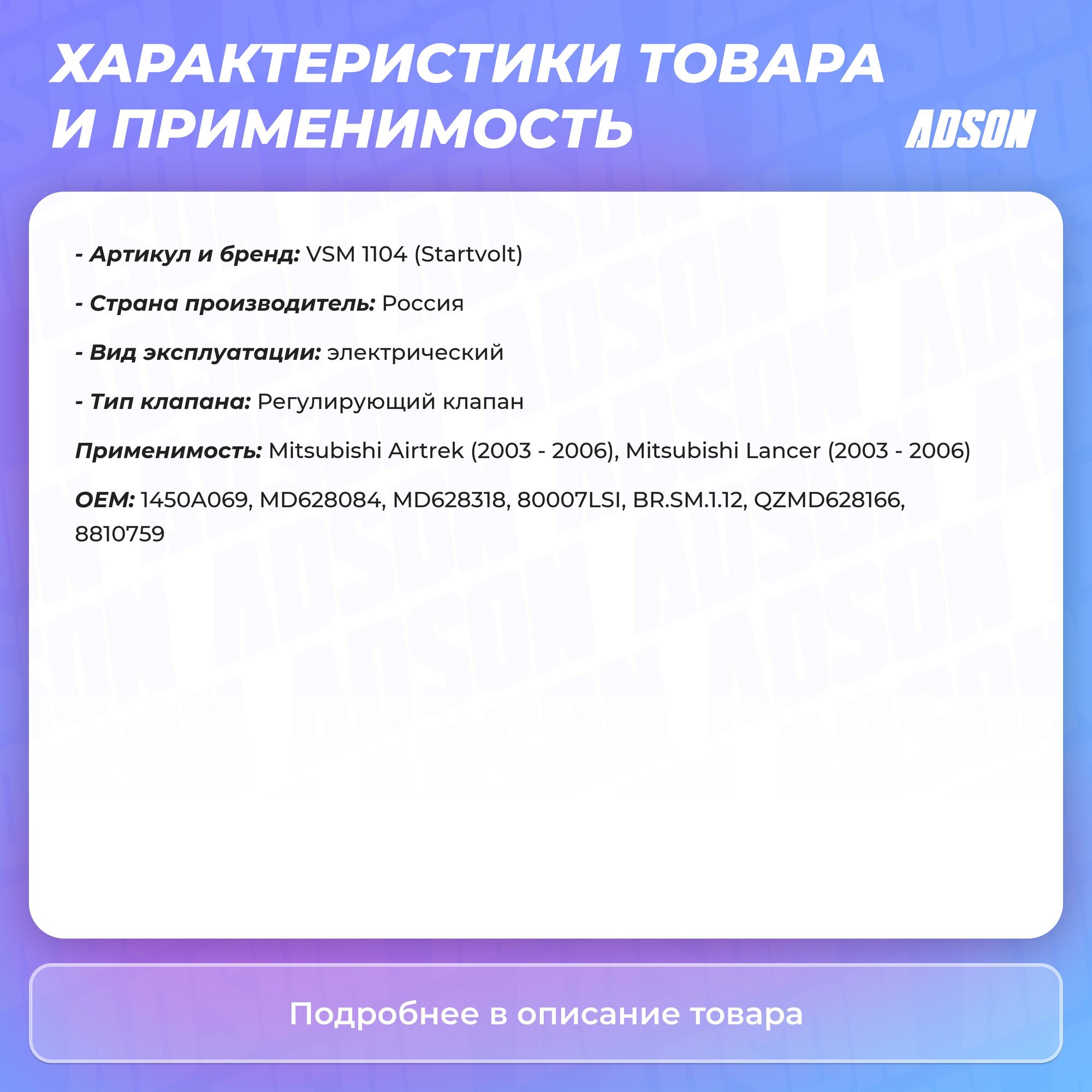 Внимание ! Цена указывается за 1 единицу товара!Вы Смотрите :Номер товара : VSM1104 Производитель : STARTVOLT Название товара : Регулятор холостого хода Доступно для заказа : 5 Минимальное количество для заказа : 1 - заказывать кратно данному числу !Внимание!Делаем отправку заказа максимум через 2 дня после заказа, в зависимости от дня недели.Цена указана за 1шт, если указывается кол-во в лоте 10, то нужно заказывать 10шт, по 1шт данный товар не отправляемНапример:Cвечи продаются по 4шт(6,8,12) минимум и кратно 4шт(6,8,12)Втулки стабилизатора (которые одинаковые) по 2шт минимум и кратно 2шт, за исключением когда втулка идет на одну из сторон, то есть правая или левая!Пружины продаются по 2шт!
