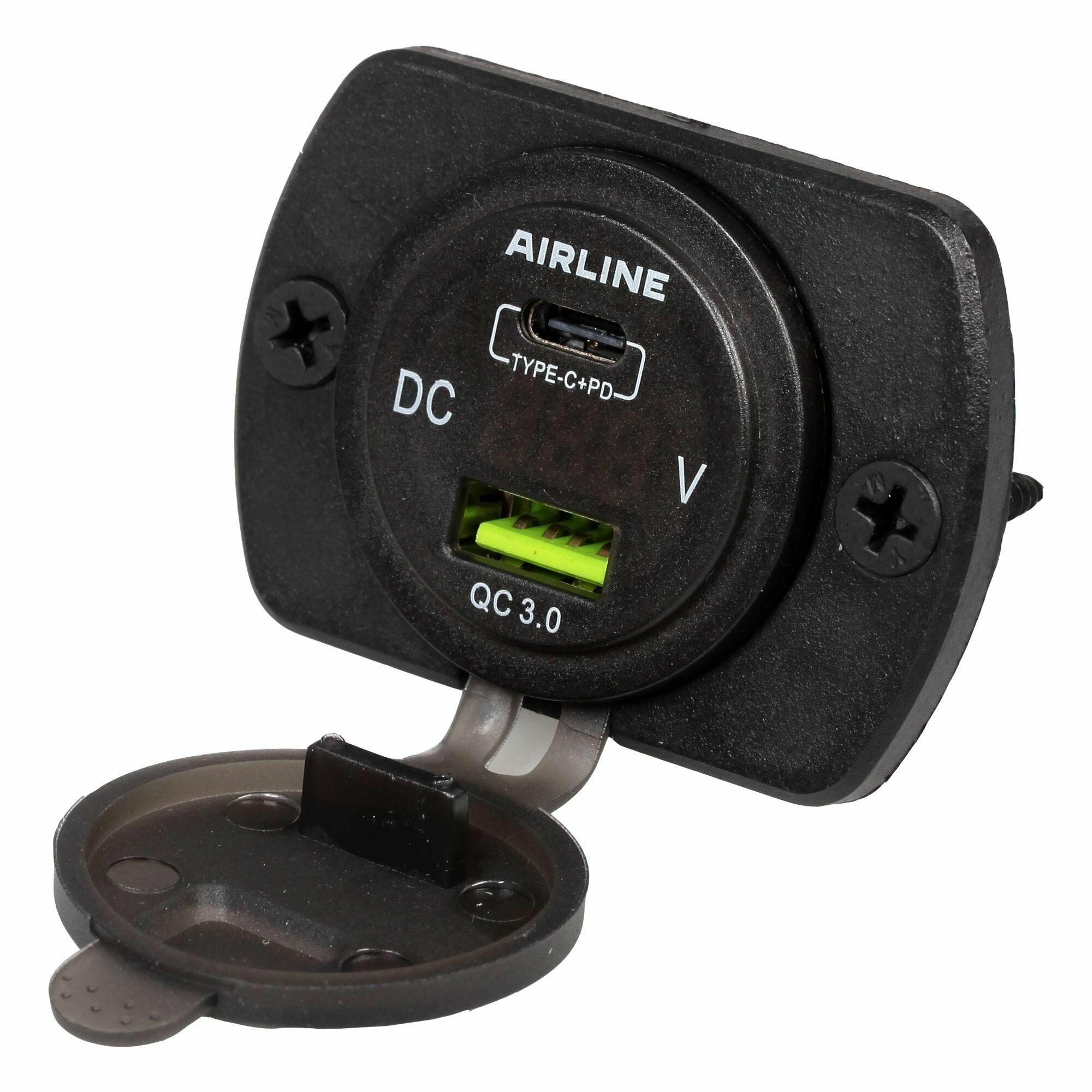 Розетка USB встраиваемая влагозащ. с 2 портами и вольтметром (5В QC3.0 + Type-c PD) AIRLINE AEBJ200
