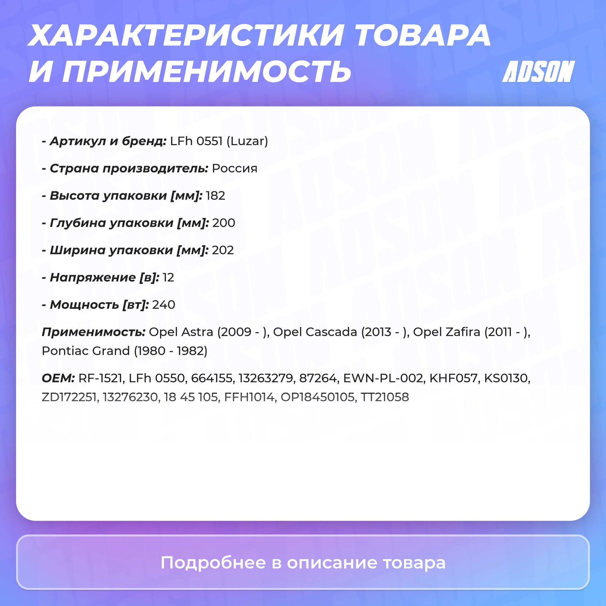 Вентилятор отопителя LUZAR обеспечивает максимально быструю циркуляцию воздуха. Вентиляторы состоят из электрического привода и пластиковой крыльчатки, устанавливаются в корпус отопителя в салоне автомобиля. У вентиляторов отопителя усовершенствованная конструкция лопастей вентилятора для высокой скорости работы и подачи большего объема воздуха. У вентиляторов отопителя откалиброваная крыльчатка, поэтому уровень шума до 50% ниже, чем у аналогов. Вал электродвигателя вентиляторов LUZAR имеют два плавающих подшипника, что снижает трение и исключает биение вала.