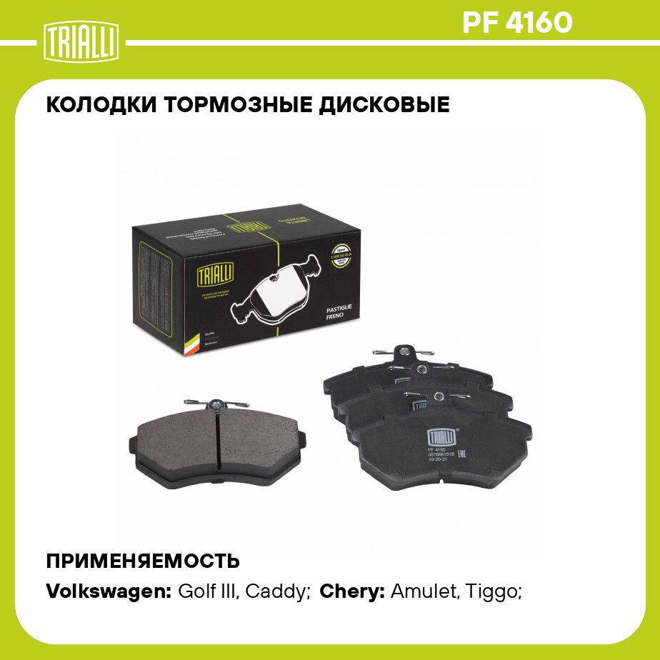 Колодки тормозные дисковые PF 4160 TRIALLI для Audi 80 1.6/1.9TD 91-94, VW Golf III/Passat 88-97 — это надёжное решение для эффективного и безопасного торможения в любых дорожных условиях. Предназначены для замены изношенных тормозных колодок, обеспечивают стабильное прижатие к тормозному диску, минимизируя риск проскальзывания и сокращая тормозной путь. Основные преимущества тормозных дисковых колодок TRIALLI: Высокая износостойкость — увеличенный срок службы за счёт применения современных фрикционных материалов. Стабильная работа при перепадах температур — эффективное торможение как в городском цикле, так и на трассе. Низкий уровень шума и вибраций — специальное покрытие и демпфирующие пластины обеспечивают тихую и плавную работу. Минимальное образование пыли — сохраняет чистоту дисков. Быстрое приработочное торможение — достигается эффективное сцепление уже с первых километров после установки. Продукция TRIALLI разрабатывается с учётом международных стандартов безопасности и проходит многоэтапный контроль качества на всех стадиях производства. При производстве используются передовые технологии, что позволяет обеспечивать стабильные эксплуатационные характеристики даже в сложных климатических условиях. Для достижения максимальной эффективности рекомендуется заменять тормозные колодки TRIALLI парами на одной оси. Перед установкой убедитесь в отсутствии повреждений на тормозных дисках и при необходимости выполните их шлифовку или замену. После монтажа новых колодок соблюдайте режим приработки: избегайте резких торможений в первые 200–300 км, чтобы обеспечить равномерное прилегание фрикционного материала к диску. Регулярно проверяйте уровень тормозной жидкости и состояние направляющих суппортов для предотвращения закисания и неравномерного износа.