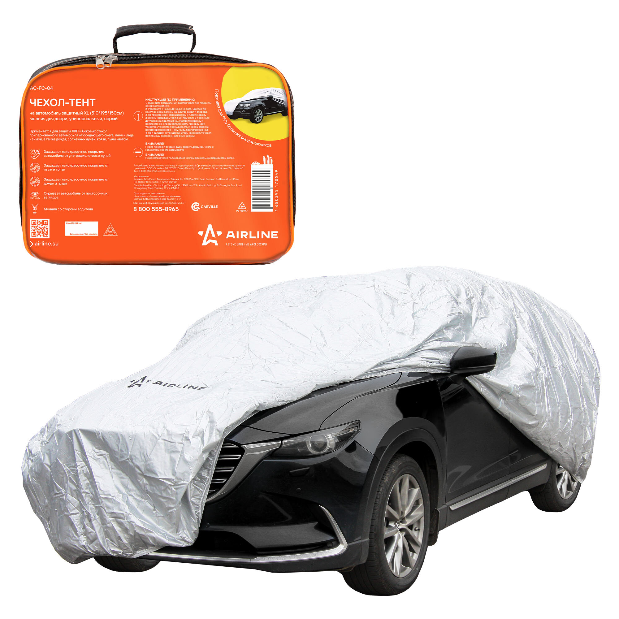Чехол-тент на автомобиль защитный XL(510*195*150см) молния для двери универсал. серый AIRLINE AC-FC-04
