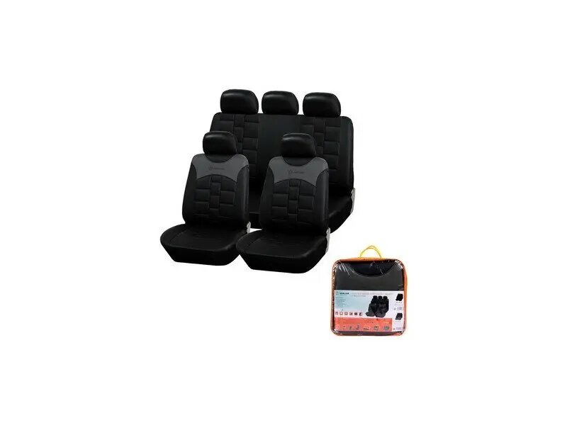 Предназначены для защиты штатной обивки сидений от механических повреждений, загрязнения и выцветания, а так же преображают внешний вид салона. Чехлы имеют универсальный размер и подходят на сиденья большинства легковых автомобилей. Модель сшита из износостойкой, высококачественной искусственной ПВХ кожи в сочетании с тянущимся гладким полиэстером, который обеспечивает хорошее прилегание к сиденьям. Чехлы имеют специальный ослабленный шов в месте расположения подушки безопасности для ее беспрепятственного открытия. Для облегчения монтажа подголовников в местах их крепления предусмотрены открывающиеся липучки.