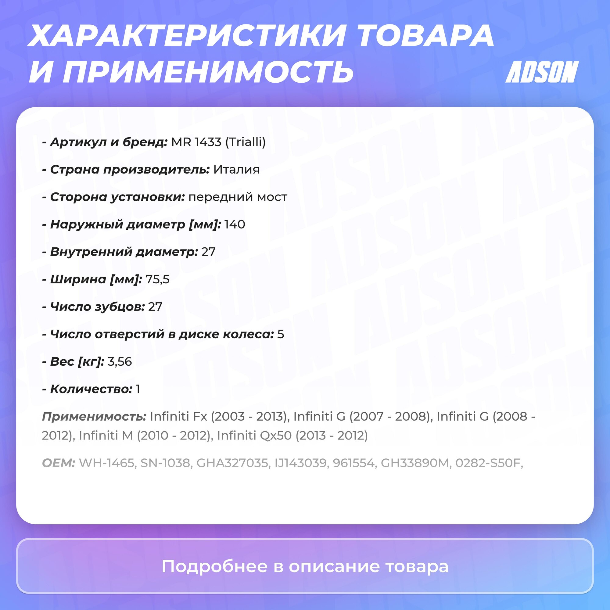 Сервис сравнения цен СкидкаГИД предлагает сравнить цены на товар «Ступица передняя в сборе с подшипником для автомобиля Infiniti FX (02-) 4WD TRIALLI (MR 1433)»