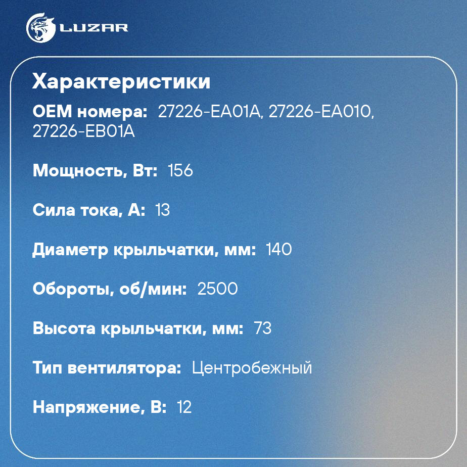 Вентилятор отопителя LUZAR обеспечивает максимально быструю циркуляцию воздуха. Вентиляторы состоят из электрического привода и пластиковой крыльчатки, устанавливаются в корпус отопителя в салоне автомобиля. У вентиляторов отопителя усовершенствованная конструкция лопастей вентилятора для высокой скорости работы и подачи большего объема воздуха. У вентиляторов отопителя откалиброваная крыльчатка, поэтому уровень шума до 50% ниже, чем у аналогов. Вал электродвигателя вентиляторов LUZAR имеют два плавающих подшипника, что снижает трение и исключает биение вала.
