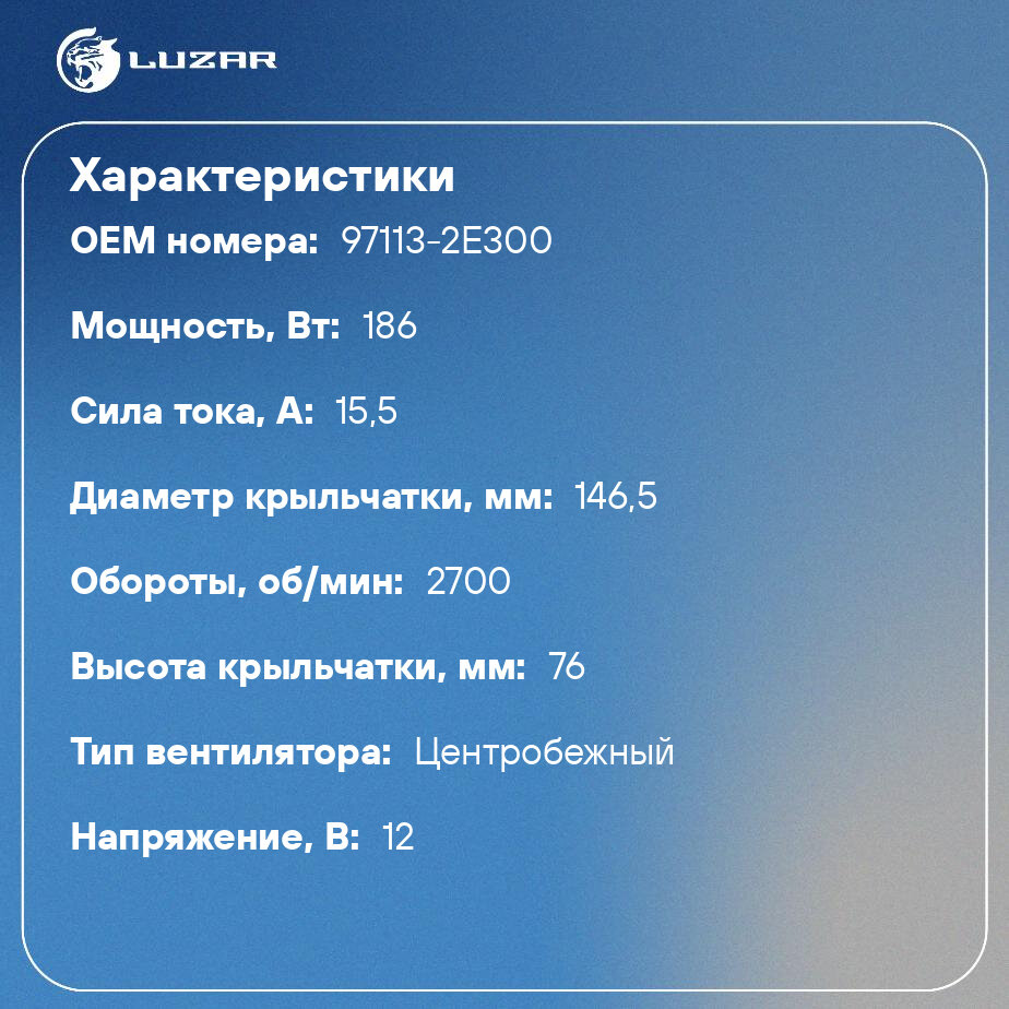 Вентилятор отопителя LUZAR обеспечивает максимально быструю циркуляцию воздуха. Вентиляторы состоят из электрического привода и пластиковой крыльчатки, устанавливаются в корпус отопителя в салоне автомобиля. У вентиляторов отопителя усовершенствованная конструкция лопастей вентилятора для высокой скорости работы и подачи большего объема воздуха. У вентиляторов отопителя откалиброваная крыльчатка, поэтому уровень шума до 50% ниже, чем у аналогов. Вал электродвигателя вентиляторов LUZAR имеют два плавающих подшипника, что снижает трение и исключает биение вала.
