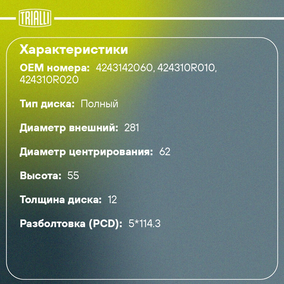 Тормозные диски TRIALLI DF 190421 для Toyota RAV 4 06-/RAV 4 13- обеспечивают эффективное торможение за счёт стабильного контакта с колодками. Разработаны для обеспечения надежного, стабильного и безопасного торможения в различных дорожных условиях.