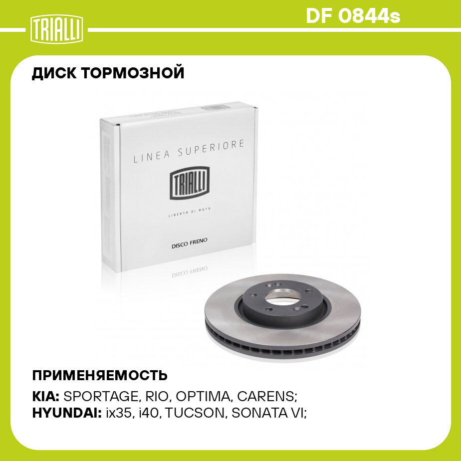 Тормозные диски TRIALLI DF 0844S для KIA Sportage III 10-, Hyundai ix35 10- обеспечивают эффективное торможение за счёт стабильного контакта с колодками. Разработаны для обеспечения надежного, стабильного и безопасного торможения в различных дорожных условиях.